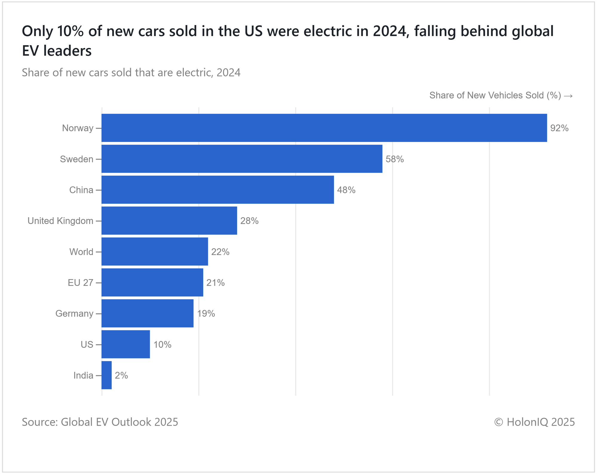 🌍 Norway leads with 92% EV Sales, followed by Sweden (58%) and China (48%), showcasing how strong policy support and clean grids accelerate adoption.