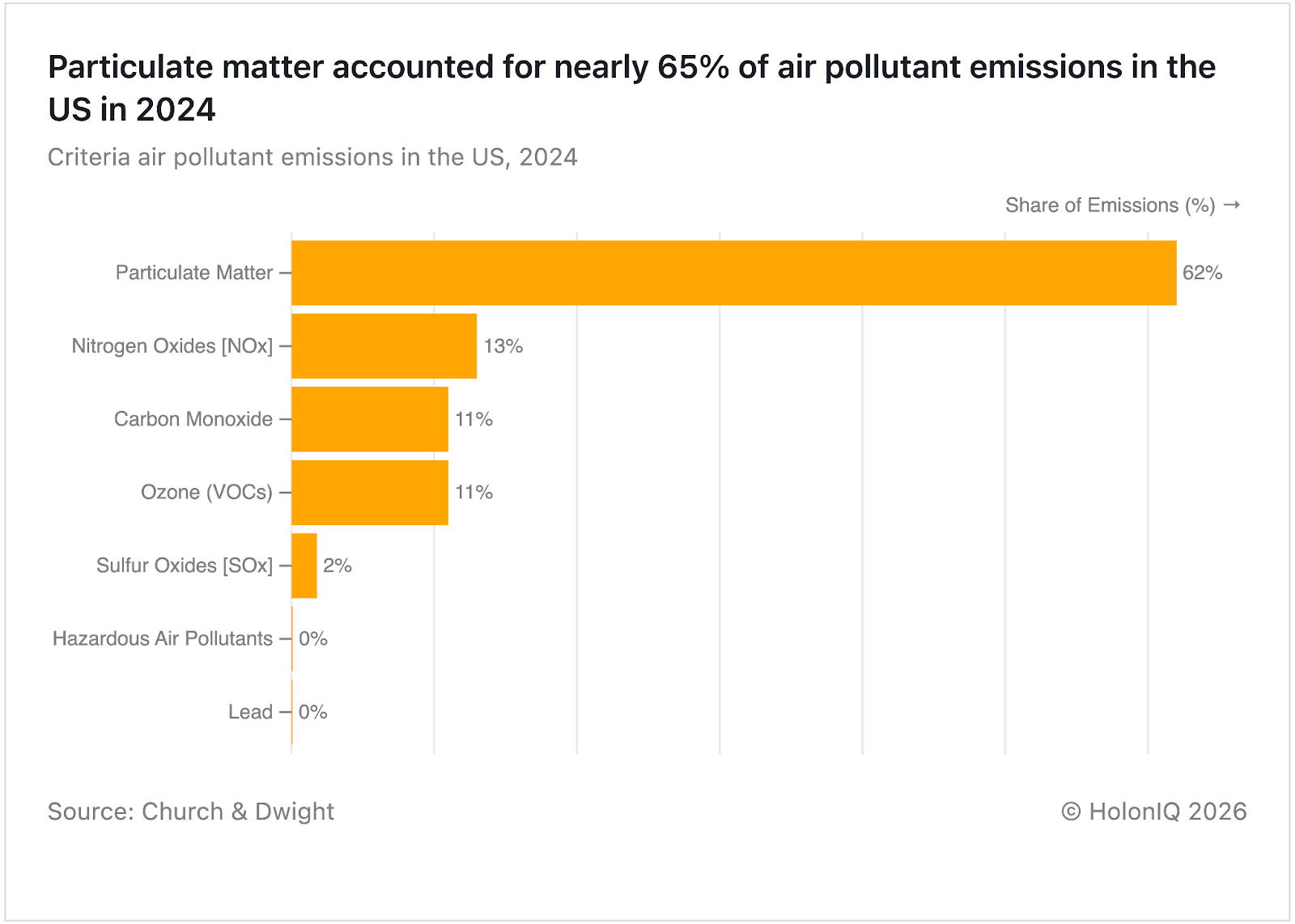 Particulate matter accounted for nearly 65% of total US criteria air pollutant emissions in 2024, far exceeding other pollutants. This reflects the dominance of combustion related sources such as road transport and construction activity, which generate fine particles at scale. Unlike gases, particulate matter is produced across many sectors and is harder to eliminate quickly. Reducing these emissions increasingly depends on cleaner vehicles, tighter industrial standards and expanded use of air quality regulations under the US Clean Air Act.