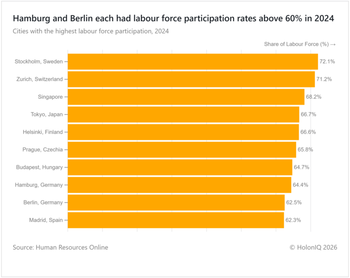 Labour force participation rates in 2024 exceeded 60% in both Hamburg and Berlin. Their relatively high participation reflects Germany’s strong employment base, supported by diversified urban economies, high female workforce participation, and widespread access to vocational training. Hamburg’s manufacturing and port-related industries sustain steady labour demand, while Berlin’s services, public sector, and growing tech ecosystem draw working-age residents. Germany’s labour market policies, including childcare support and flexible work arrangements, continue to underpin urban workforce engagement.