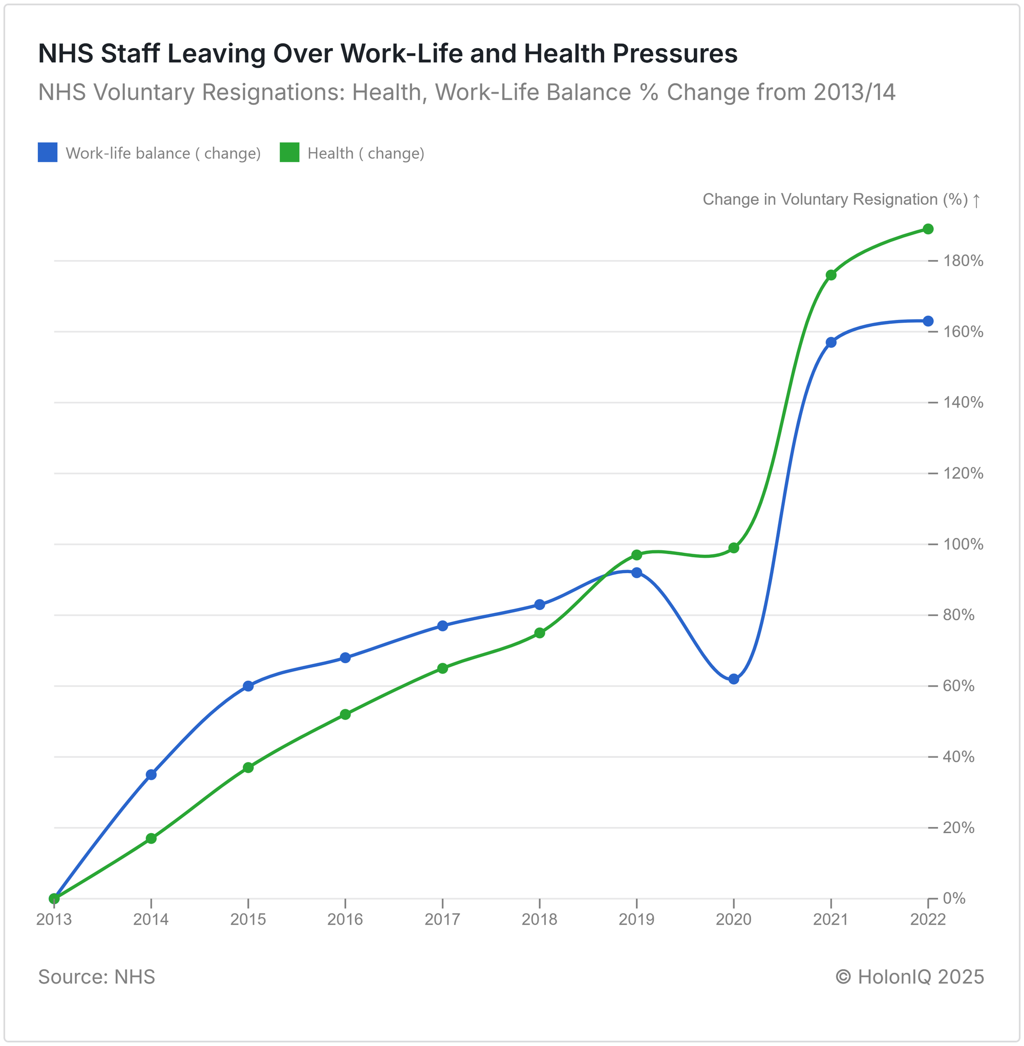 📉 Since 2013/14, resignations citing work-life or health problems have more than tripled. This sharp rise exacerbates existing staff shortages, posing a major challenge for recruitment and retention efforts within the NHS.