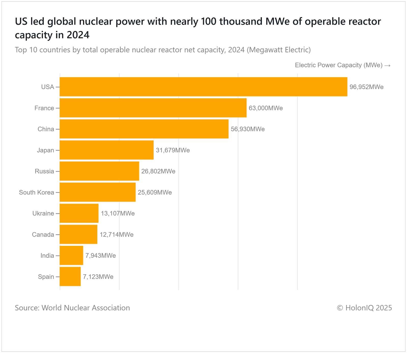 The United States of America holds the world's largest operable reactor capacity at 96,952 MWe, a fleet that supplies about 30% of worldwide nuclear generation. This dominance coincides with soaring electricity demand from new data centers, prompting the planned restart of retired plants, such as Holtec’s Palisades Nuclear Plant in Michigan. Supporting these efforts, the Department of Energy (DOE) has utilized the Energy Infrastructure Reinvestment (EIR) Program to issue a $1.5B loan guarantee for the Palisades restart.