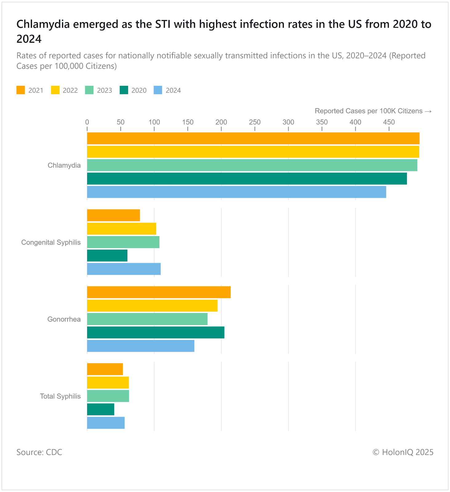 Chlamydia had the highest number of US STI cases from 2020-2024, peaking at approximately 490 cases per 100K citizens in 2022. High rates stem from increased screening, asymptomatic transmission, and healthcare disruptions during COVID-19. The HHS STI National Strategic Plan (2021-2025) targets prevention through expanded testing, treatment access, and addressing health disparities. CDC guidelines emphasize routine screening for at-risk populations and partner notification protocols.