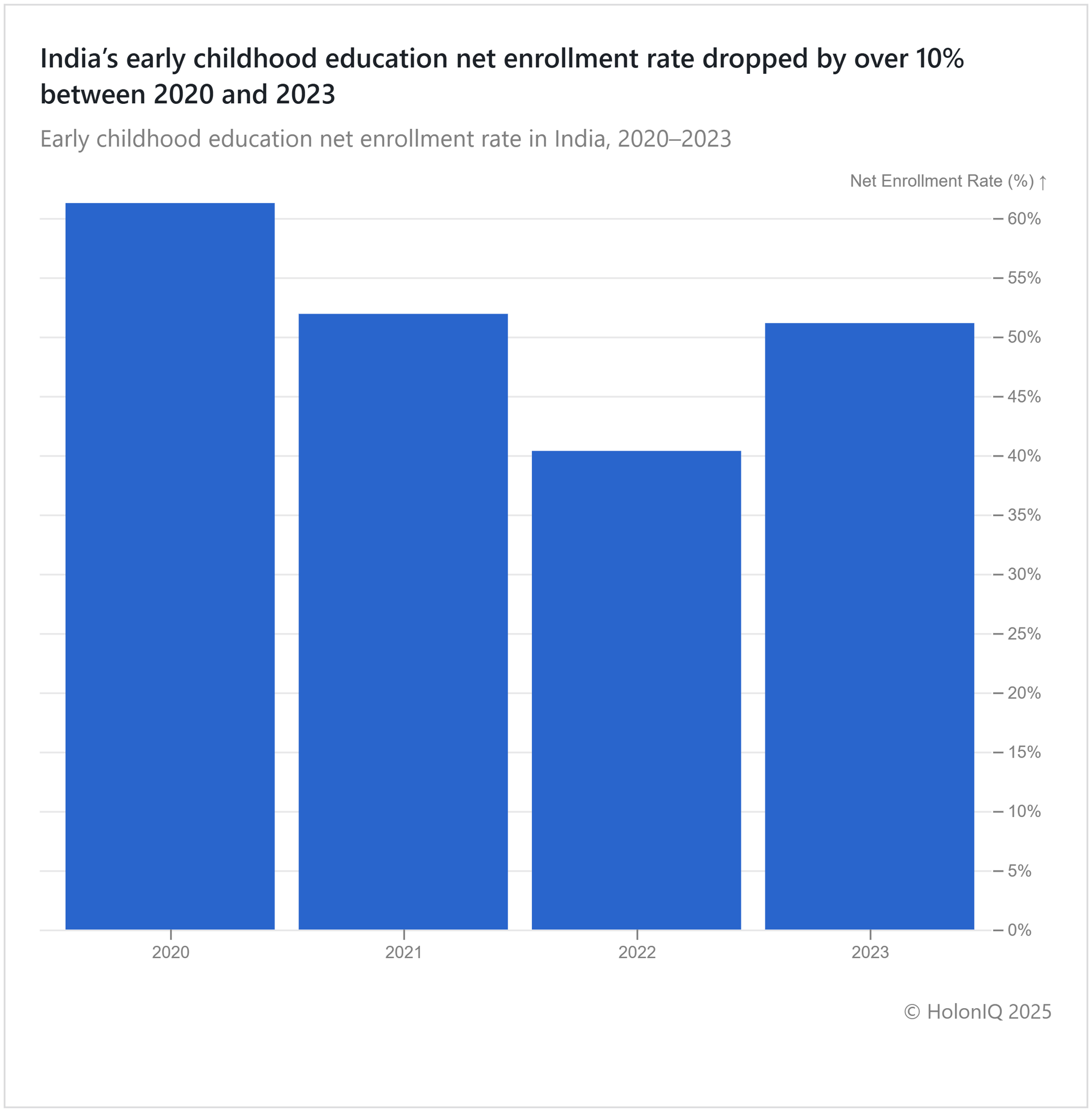 India’s early childhood education net enrollment fell from over 60% in 2020 to just above 40% in 2022 due to the pandemic, before rebounding to over 50% in 2023. The government aims for universal quality ECCE by 2030 through the National Education Policy (NEP) 2020 and the National Policy on Early Childhood Care and Education (ECCE). Key initiatives like Samagra Shiksha Abhiyan and ICDS support this goal by enhancing access and quality in early learning.