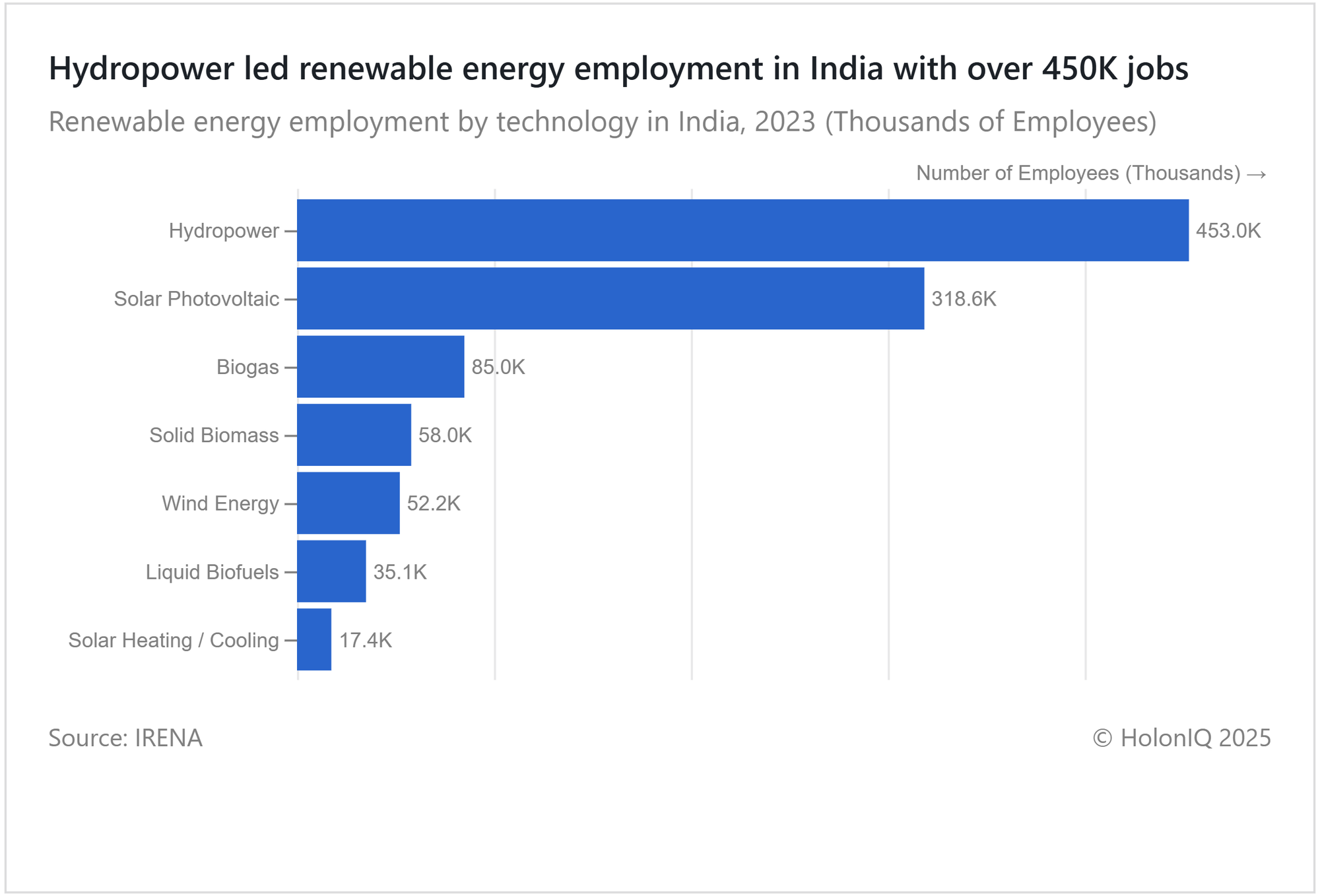 In 2023, India's renewable energy sector employed over 1 million people, led by hydropower with over 450K jobs and solar photovoltaic. Other contributors included biogas, biomass, wind, biofuels, and solar heating/cooling. This growth aligns with India's renewable energy goals, supported by policies like the National Green Hydrogen Mission, aimed at making India a green hydrogen hub, and the PM KUSUM Scheme, promoting solar energy in agriculture and boosting rural employment. These initiatives drive economic growth and sustainable livelihoods.
