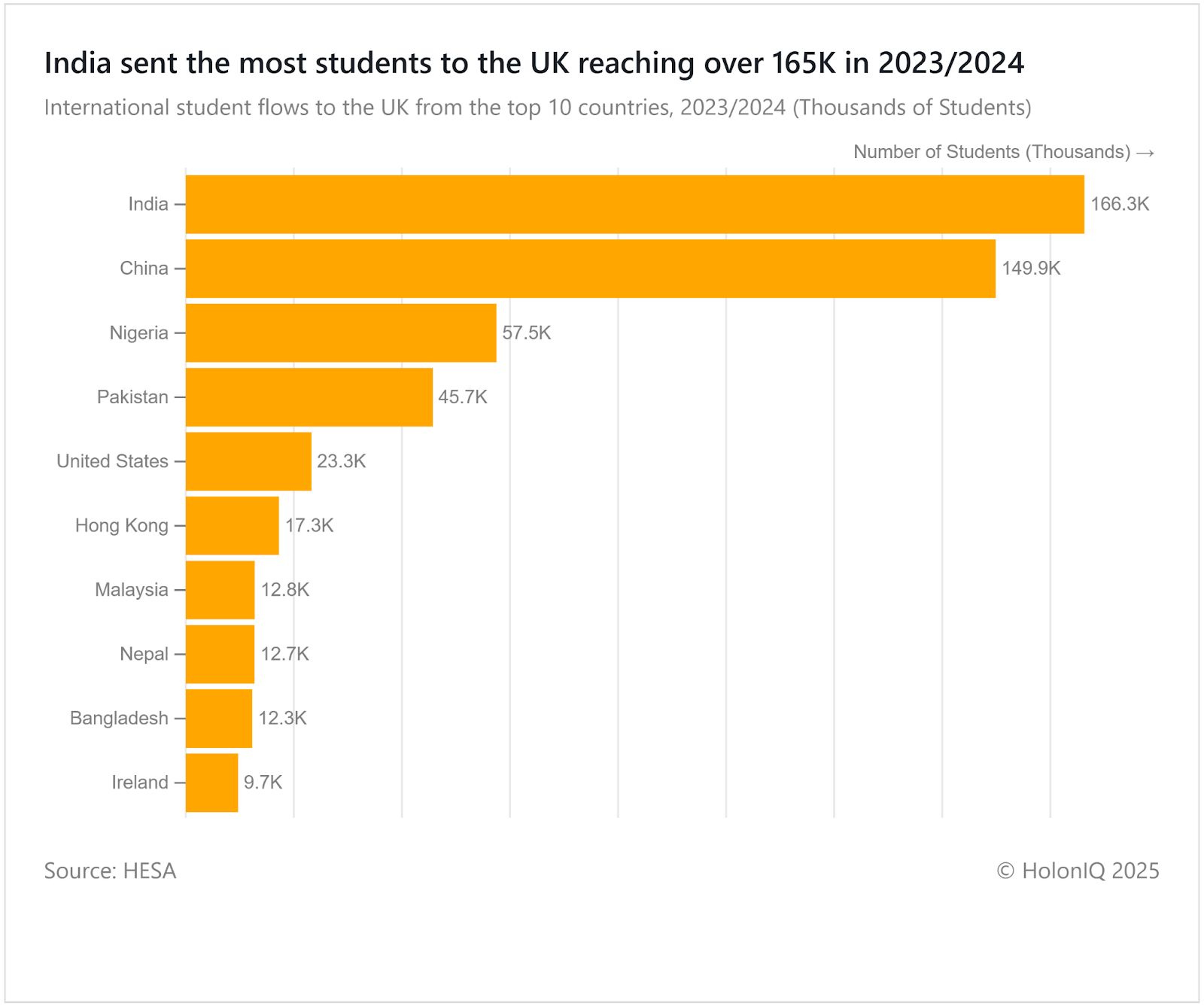 India sent 166K students to the UK in 2023/24, overtaking China at 150K, while Nigeria and Pakistan followed at 58K and 46K. The data highlights South Asia’s growing dominance in UK student inflows, shifting the balance away from China. This trend mirrors global competition for talent, with the US recently unlocking funds for Fulbright and EducationUSA to sustain appeal. The UK’s Graduate Route visa, overseen by the Home Office, remains central to attracting and retaining these students.
