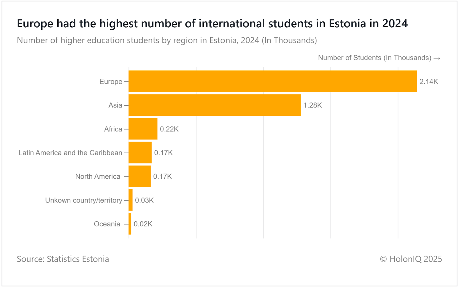 International student enrolment in Estonia was led by Europe and Asia, together accounting for more than 3,000 students. The steady international interest reflects Estonia’s rise in the education field with a high PISA score along with a low illiteracy rate for adults. This is supported by English language programs and strong ICT sectors. Estonian Higher Education Internationalisation Strategy continues to strengthen global partnerships and attract diverse student talent.