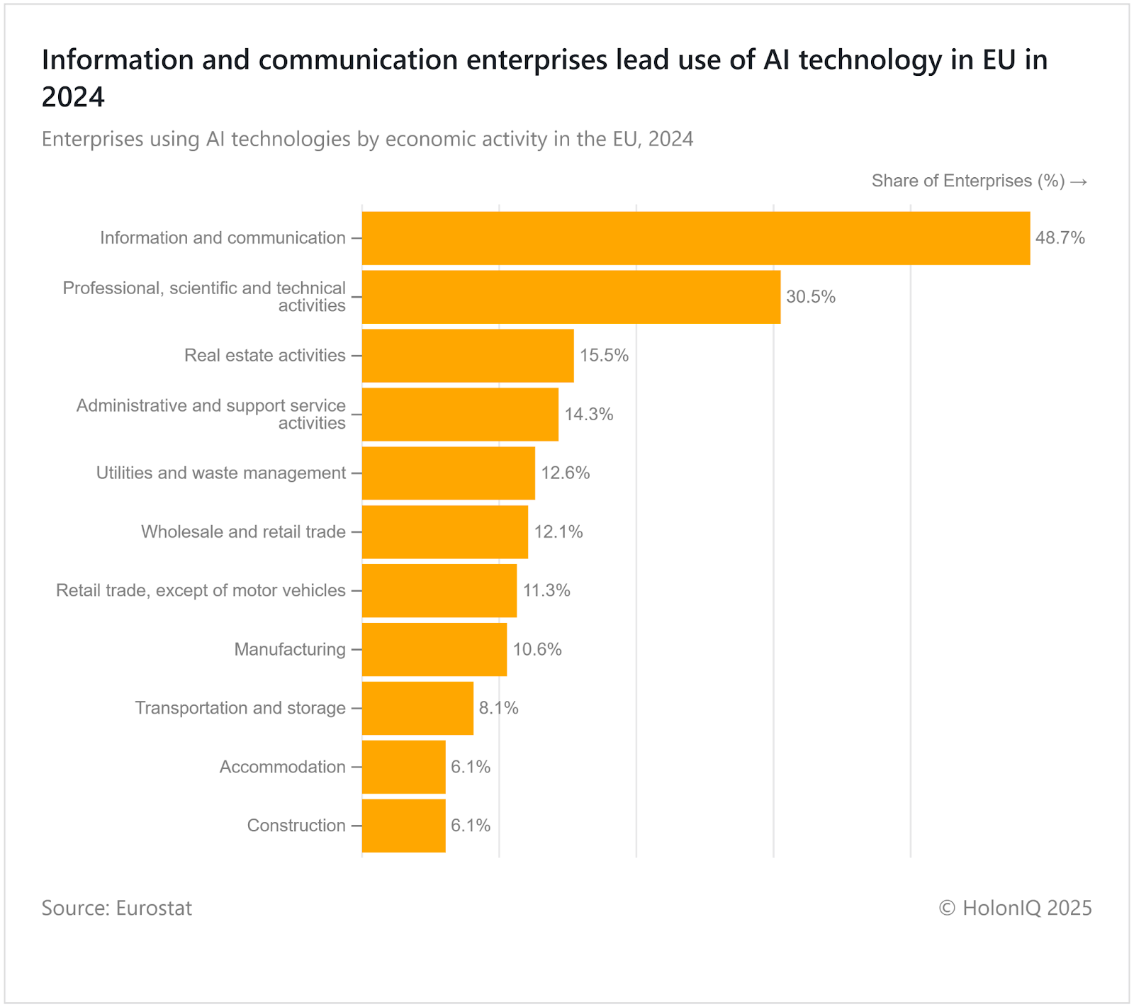 AI adoption among EU companies has risen by 5.5% over the last year, reaching 13.48%. The positive trend is primarily driven by the information and communication sector, which has an AI usage rate of 48.7%. However, Europe still struggles with its inability to move beyond experimental pilot projects and successfully deploy AI solutions for daily business operations. To improve their position, the EU is launching projects like InvestAI, with the goal of mobilizing €200B in investments.