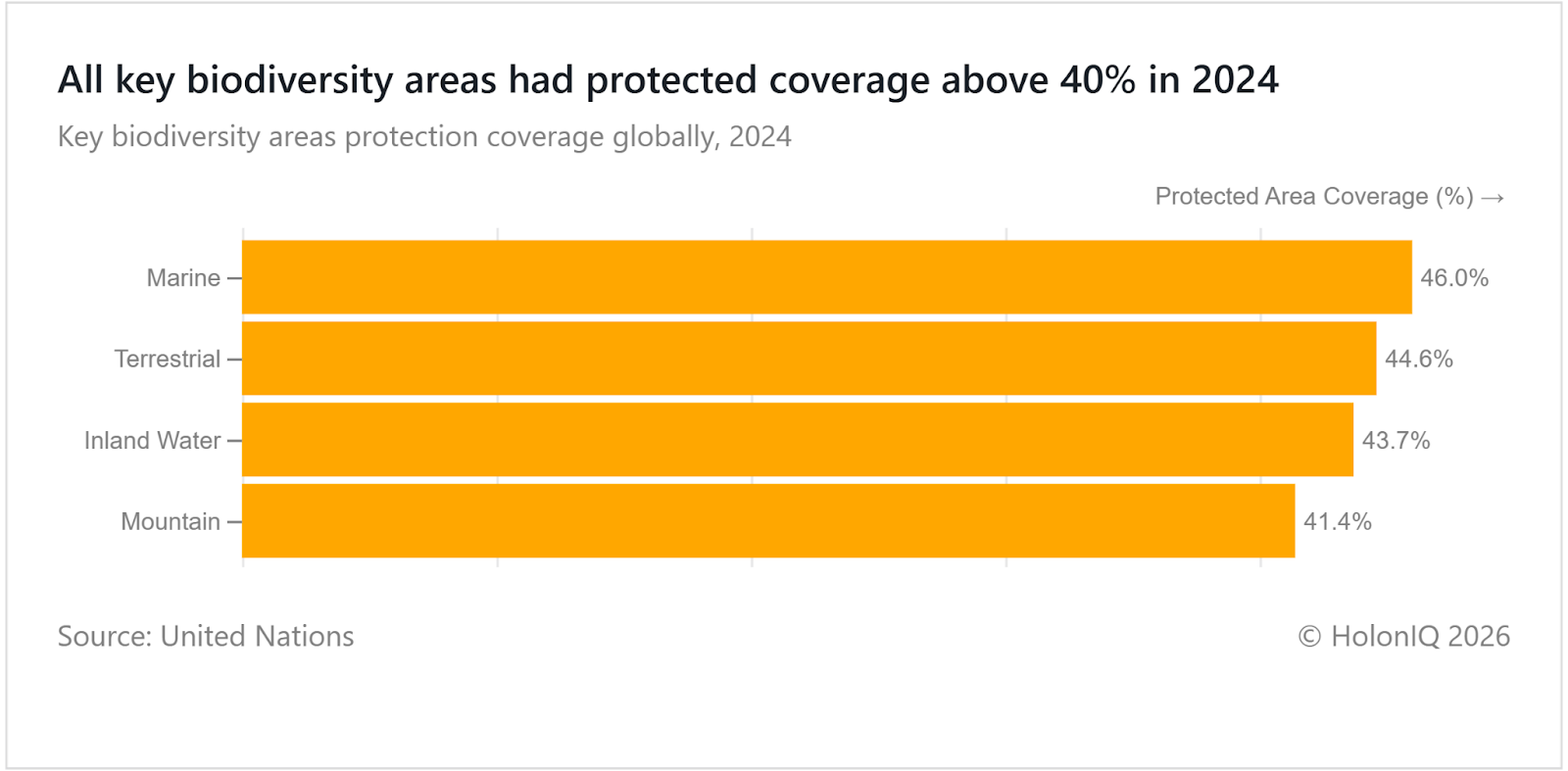 Globally, over 40% of key biodiversity areas (KBAs) are now under protection. These sites are crucial for preserving species, maintaining ecosystem services, and supporting climate resilience. Expanding coverage of KBAs ensures that vulnerable habitats are safeguarded from development pressures and overexploitation, reinforcing global efforts to protect biodiversity for current and future generations. These areas are increasingly safeguarded through global initiatives and corporate funding, linking conservation efforts to sustainable business practices.