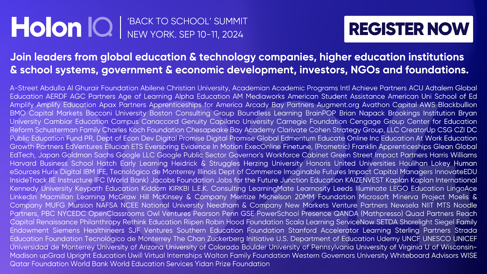 Tickets will sell out in the coming weeks for the HolonIQ Back to School Summit in New York on September 10β11 in New York City. The Summit will bring together 500 influential leaders from Pre-K to Higher Education and Workforce, Philanthropic foundations, leading education companies and policymakers, major institutional investors, and technology leaders for roundtables, presentations, and networking. Register here before tickets sell out.