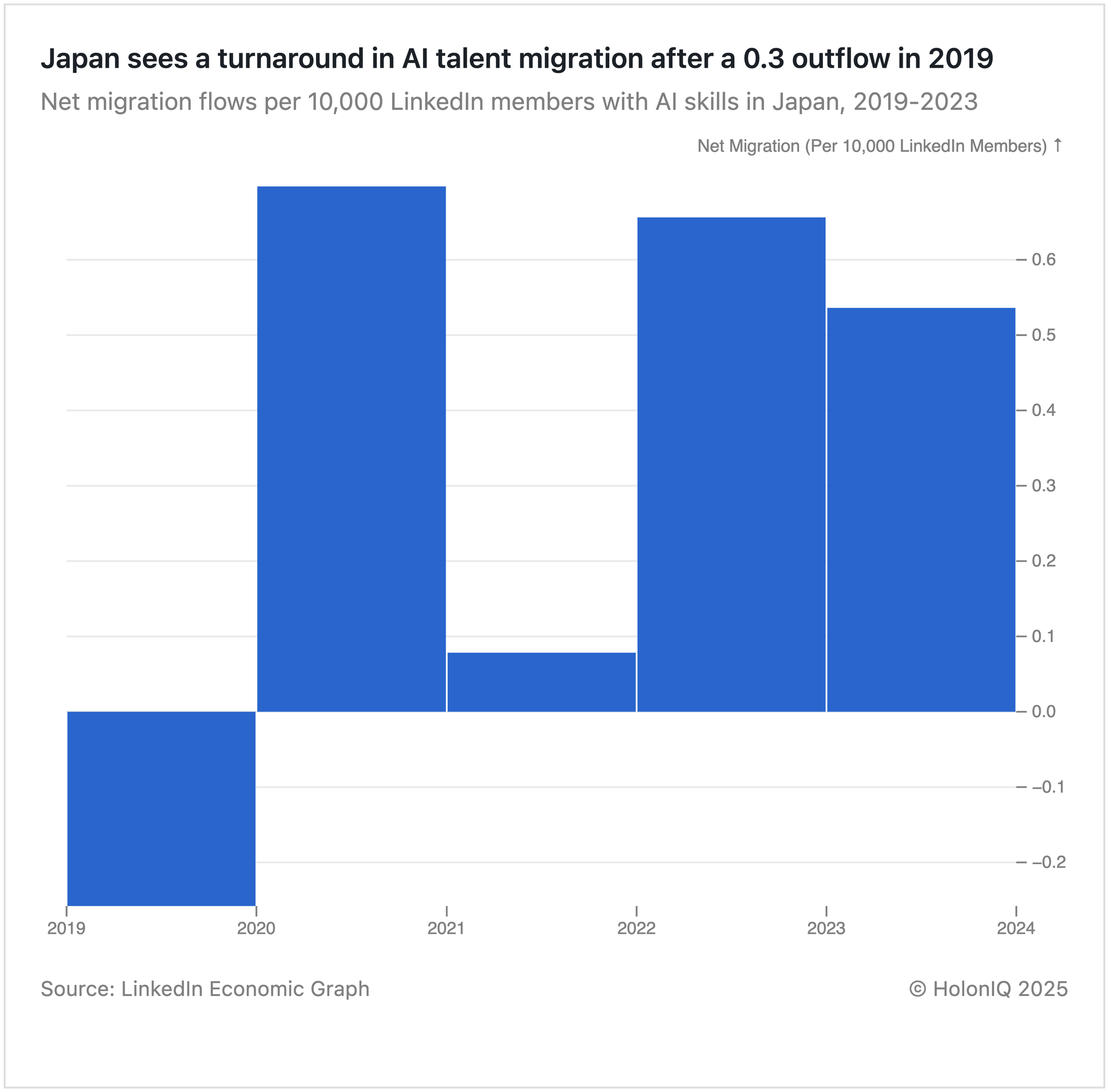 Japan’s AI talent migration shifted from a net outflow of -0.26 per 10,000 members in 2019 to a peak inflow of 0.70 in 2020 before stabilizing between 2021 and 2023. This aligns with Japan’s AI Strategy 2022, which aims to train 250,000 AI professionals annually, alongside policies like the Highly Skilled Professional Visa, strengthening the AI workforce and positioning Japan as a competitive AI hub.
