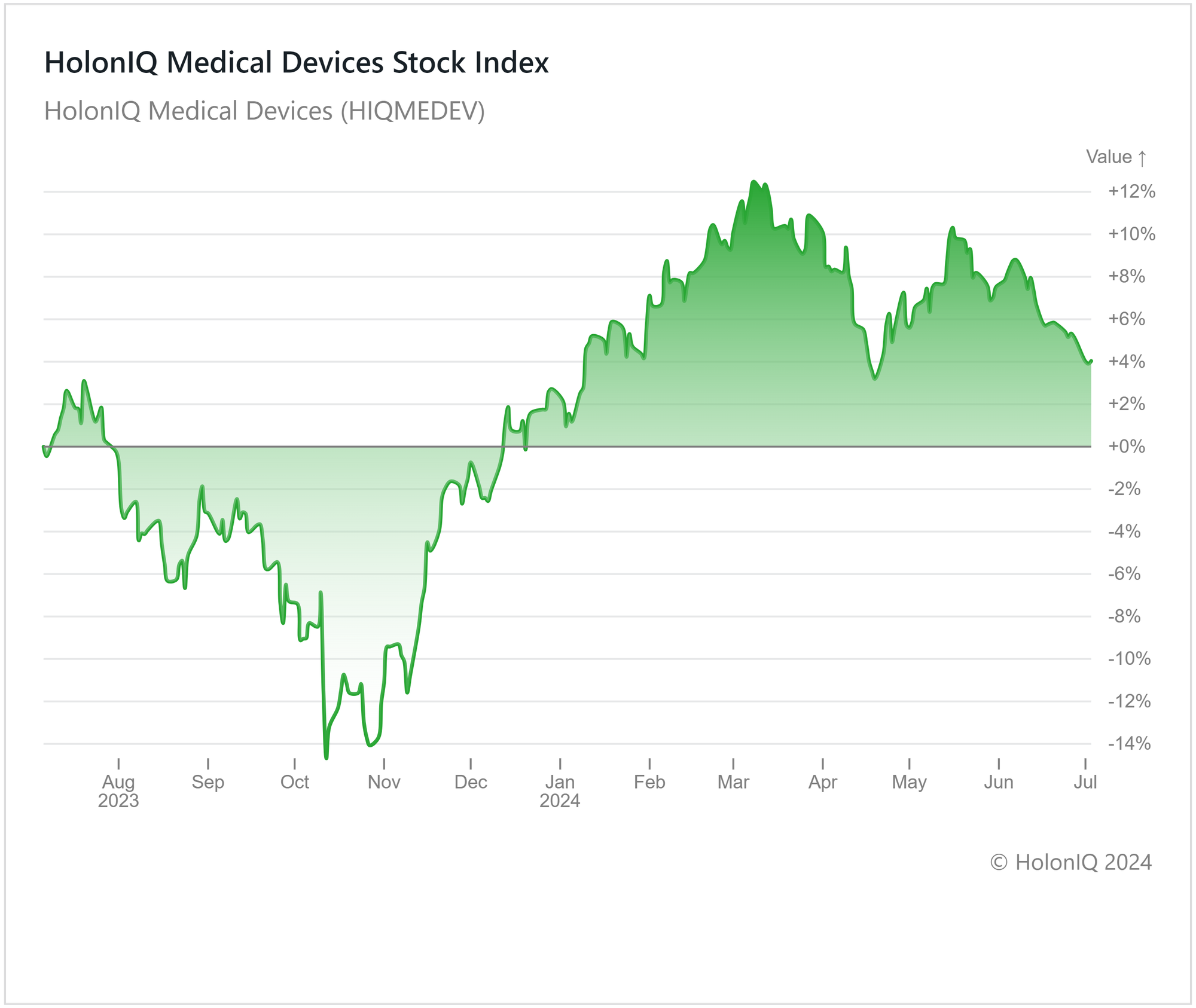 However, recent months have seen volatility, culminating in a 4% decline over the past quarter. This downturn stems from multiple pressures such as governments worldwide pushing to lower healthcare costs and intensifying pricing pressures on medical devices, particularly in hospital settings. Regulatory hurdles, such as the European Medical Device Regulation and China's local innovation initiatives, have added complexity and uncertainty, impacting operational strategies. This has been reflected in key stocks within the index, with notable declines seen in significant players like Medtronic ($99B MCap), Abbott Laboratories ($178B MCap), and Stryker Corp ($126B MCap), showing decreases of 9%, 8%, and 5% respectively over the past quarter.