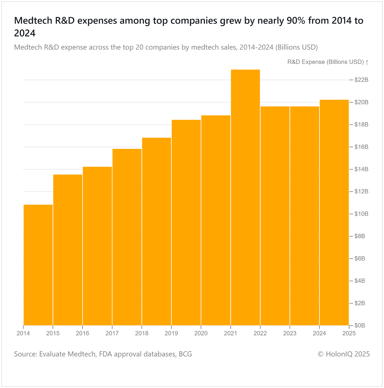 R&D spending among top medtech companies climbed nearly 90% from 2014 to 2024, reaching approximately $22B by 2022 before stabilising. This sustained investment reflects industry priorities in artificial intelligence integration, minimally invasive devices, and digital surgery platforms. Leading firms now allocate 7-8% of revenues to R&D, with AI-enabled medical devices surpassing 1K FDA clearances in 2024, more than tenfold the 2020 count. The FDA established its Artificial Intelligence/Machine Learning Medical Device Action Plan in 2021, creating regulatory pathways for adaptive algorithms and advancing healthcare innovation.