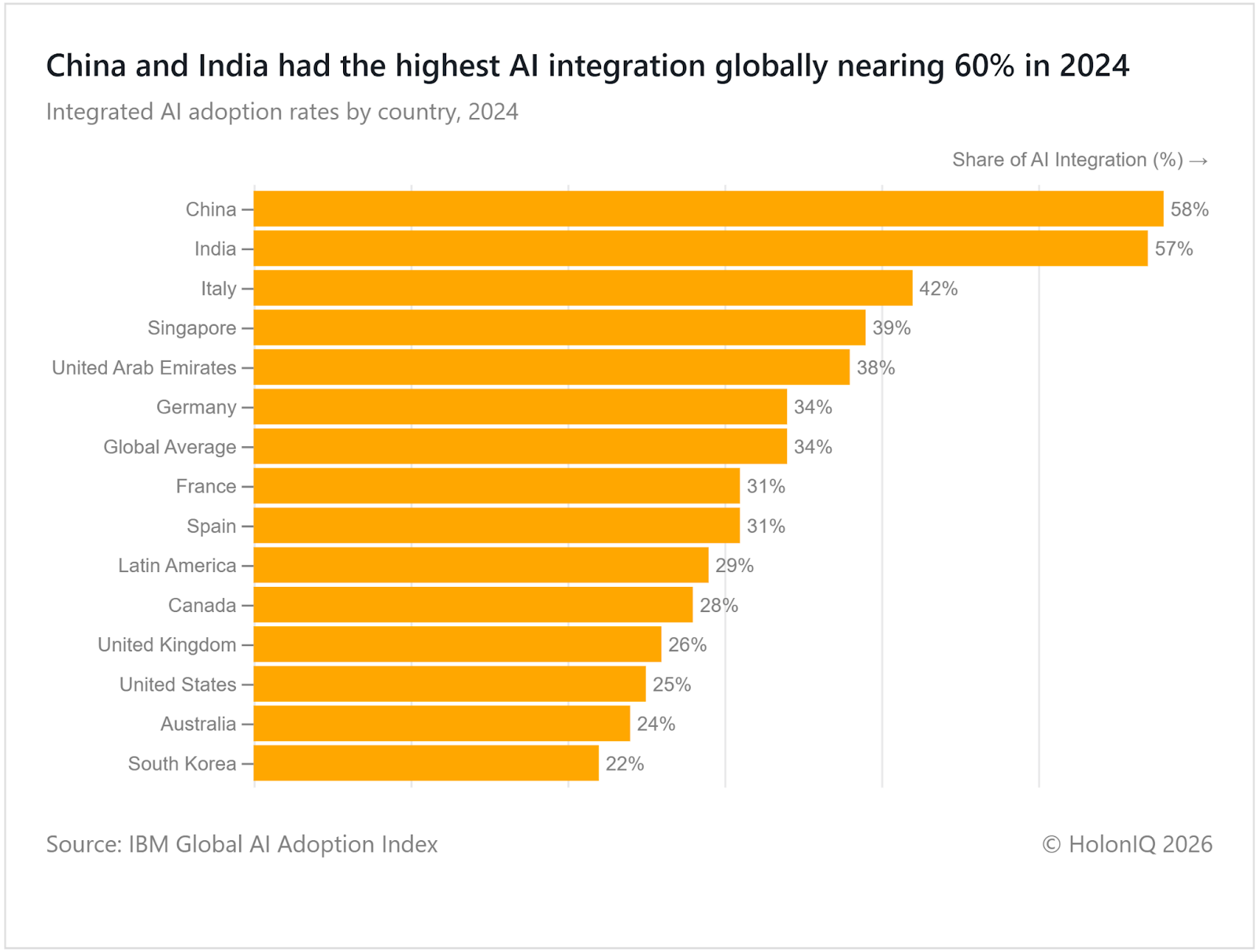 China and India lead global integrated AI adoption in 2024, with rates approaching 60%, driven by fast growing digital markets and strong government support for technology expansion. Their vast consumer bases allow companies to scale AI services quickly across finance and public services. Large data availability also accelerates innovation. As competition rises, AI adoption is becoming central to economic growth and future workforce development worldwide.