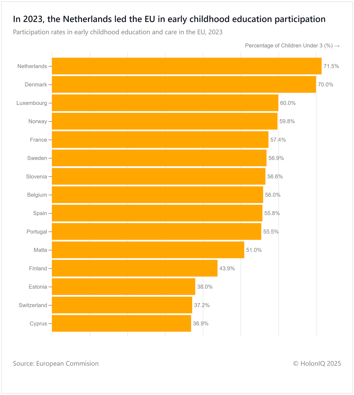 Early childhood education and care participation among under-threes reached 71.5% in the Netherlands and 70% in Denmark in 2023, far above the EU average. Rates remain strong in Luxembourg, Norway and France, showing a steady upward trend in northern and western Europe. Southern countries like Spain and Portugal are closing gaps, while Finland and Estonia lag. Accessibility and resource shortages remain as barriers to improving participation. The EU Child Guarantee (European Commission) seeks to boost access and equity across member states.