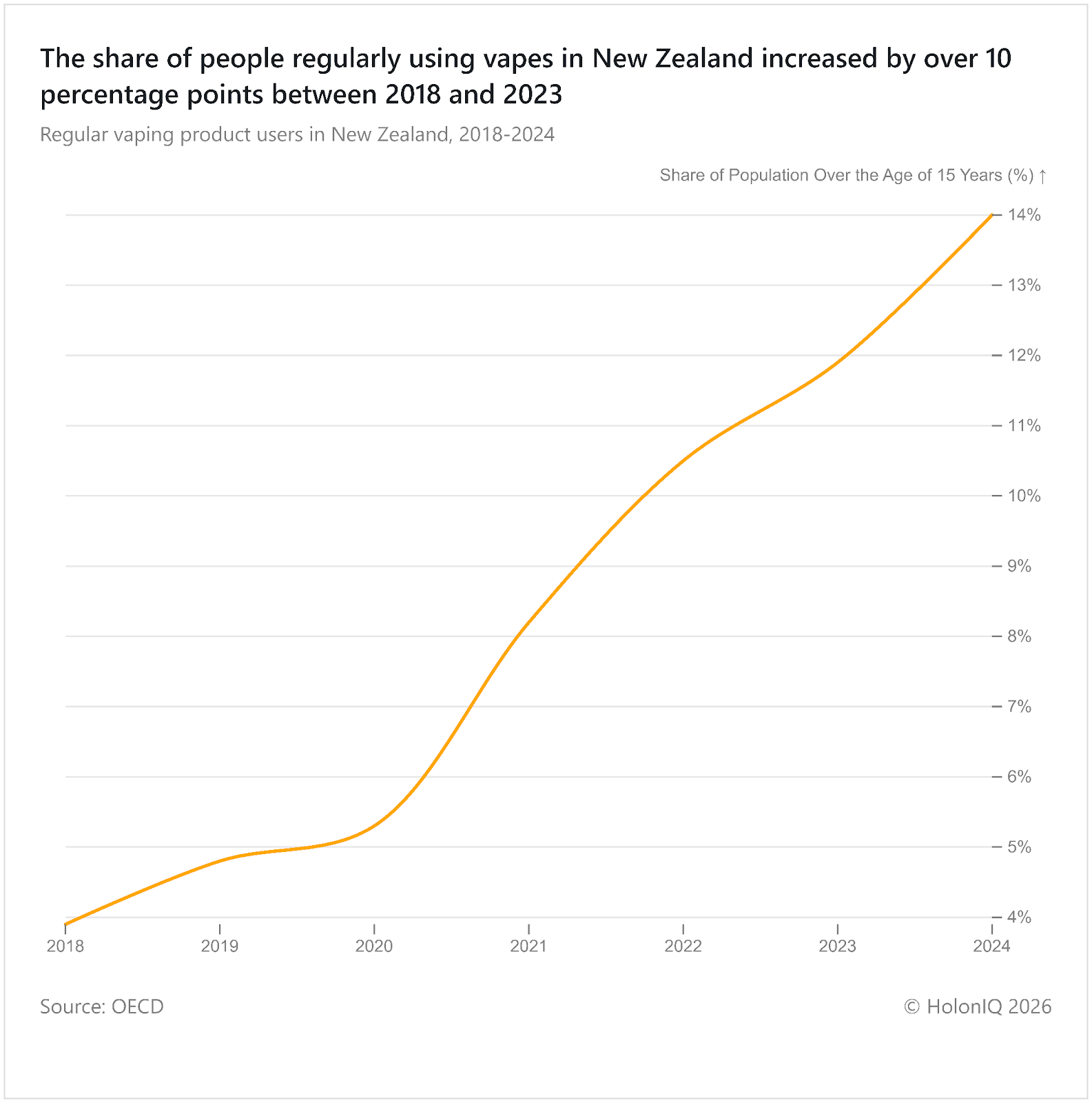 Regular vaping in New Zealand reached 14% in 2024, indicating rapid growth. This rise reflects shifting consumer behaviour, particularly among younger populations adopting alternatives to traditional smoking. Increased availability, targeted marketing, and a perception of reduced harm contribute to higher uptake. Many youth engage in "dual use," smoking both traditional cigarettes and vaping. The Smokefree Aotearoa 2025 Action Plan implemented by the New Zealand Government aims to reduce smoking and regulate vaping products.