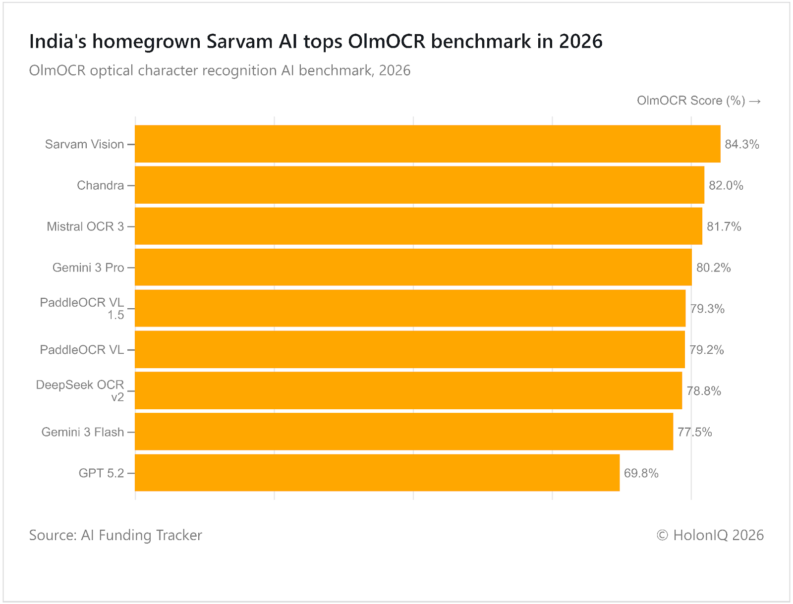India's homegrown Sarvam AI topped the OlmOCR AI benchmark in 2026, surpassing traditional giants such as ChatGPT and Gemini. This benchmark evaluates the image and document reading capabilities of AI models. Sarvam AI has been locally developed in India as a quickly scaled startup, specialising in local language accessibility in LLMs. With speech-to-text capabilities, native language readability among many of its unique offerings, it has also secured major funding and government support. This portrays the rise in native capability-driven AI models, with widespread AI models being overtaken in these capabilities.