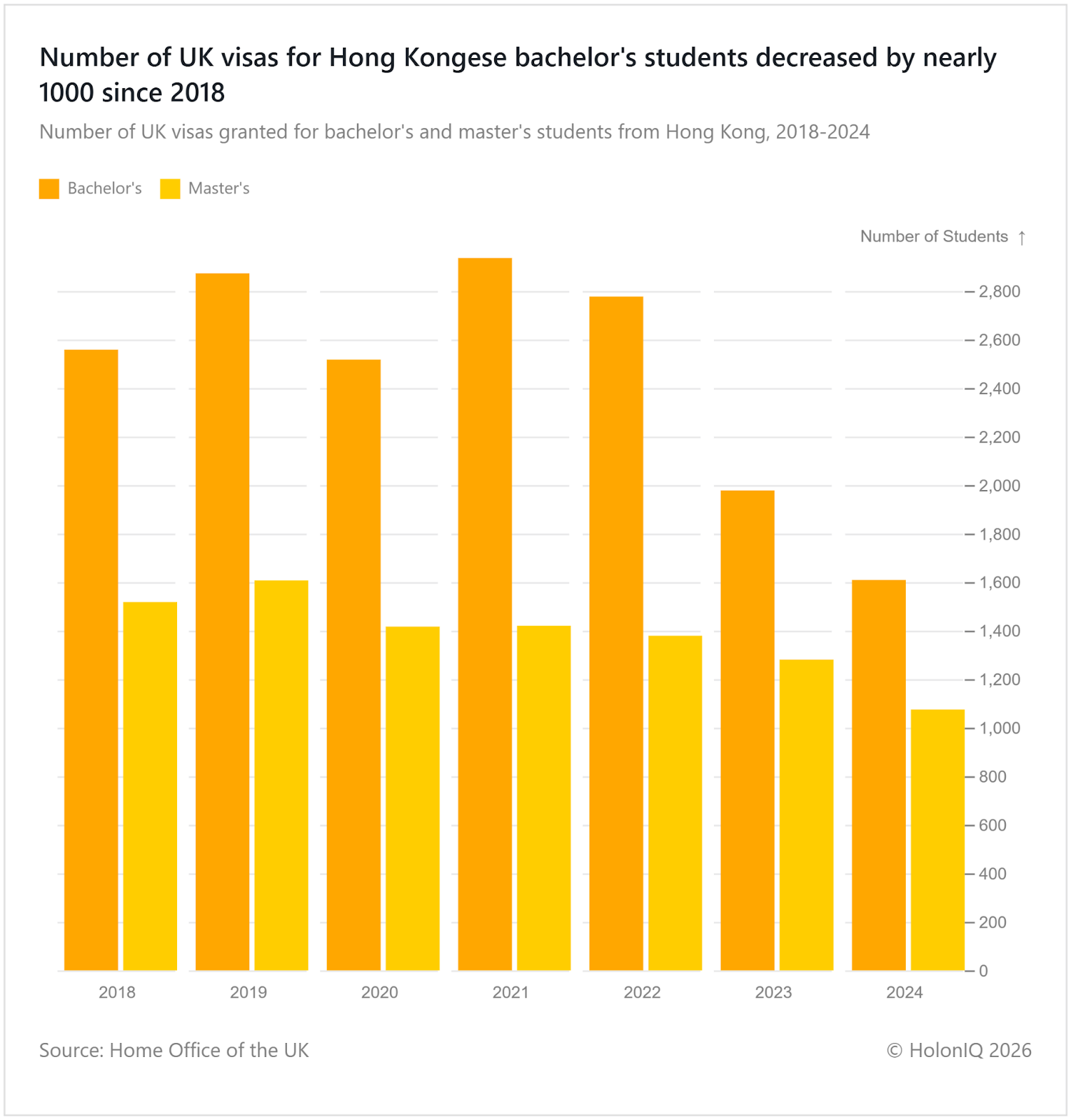 UK study visas for main applicants continued to decline in 2024, with Hong Kong specifically seeing a near 15% decrease. Key drivers include visa restrictions affecting many international students, as well as restrictions on dependents. Proposed changes, such as reducing the Graduate Route from two years to 18 months and introducing new levies on international student fees, have further weakened the UK’s attractiveness. As a result, students are increasingly choosing alternative destinations such as Australia, Germany, and local Hong Kong institutions.