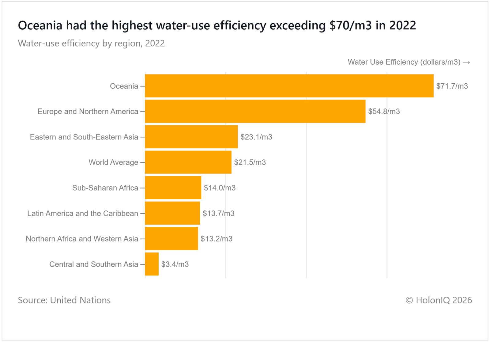 Water-use efficiency measures the amount of economic value generated per cubic meter of water used, showing how effectively a region converts water into goods and services. Oceaniaโs efficiency is high because its water intensive industries and water policies allow it to produce more economic value with relatively limited water resources. Improving water-use efficiency is critical for sustainability, particularly in regions facing water scarcity and growing demand for agriculture and industry.
