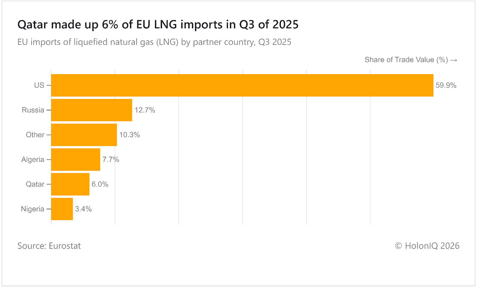 Consistent supply of LNG remains critical for the European Union, supporting both industrial activity and domestic heating. Qatar's 6% EU LNG share carries strategic importance, as recent production disruptions triggered severe price volatility, while European storage sits 30% compared with a 54% average. The European Union is planning to reduce its overall LNG use over the next few years as part of broader energy security and decarbonization efforts, and forecasts show a decline in gas demand and LNG imports between 2025 and 2030 as well.