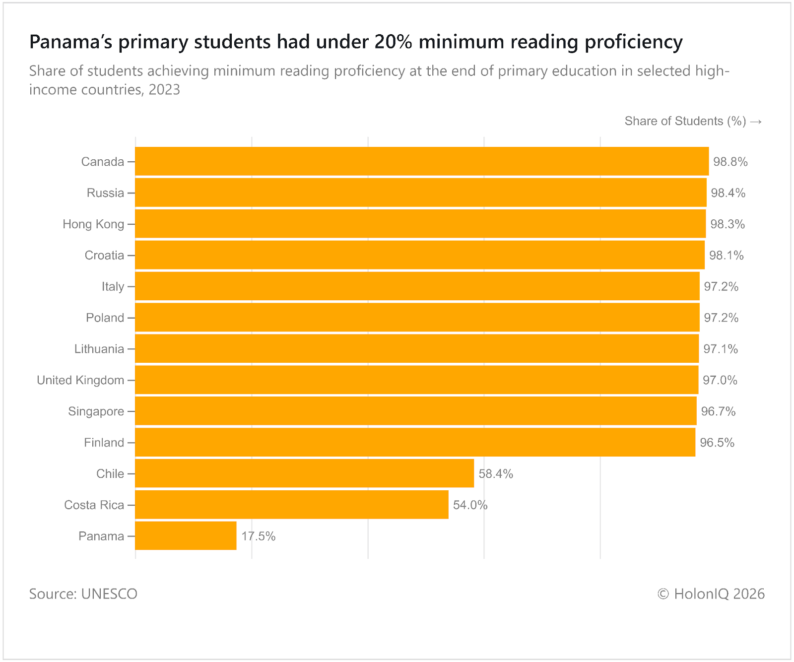 Reading proficiency in 2023 remains above 95% across most high-income countries, but drops sharply to 17.5% in Panama. This reflects structural challenges in education, including regional inequality. Reports from the World Bank note persistent disparities between urban and rural education access, leading to such a low reading proficiency rate. The World Bank and other organisations have joined forces to support quality-improvement programs that strengthen literacy and teacher training nationwide.