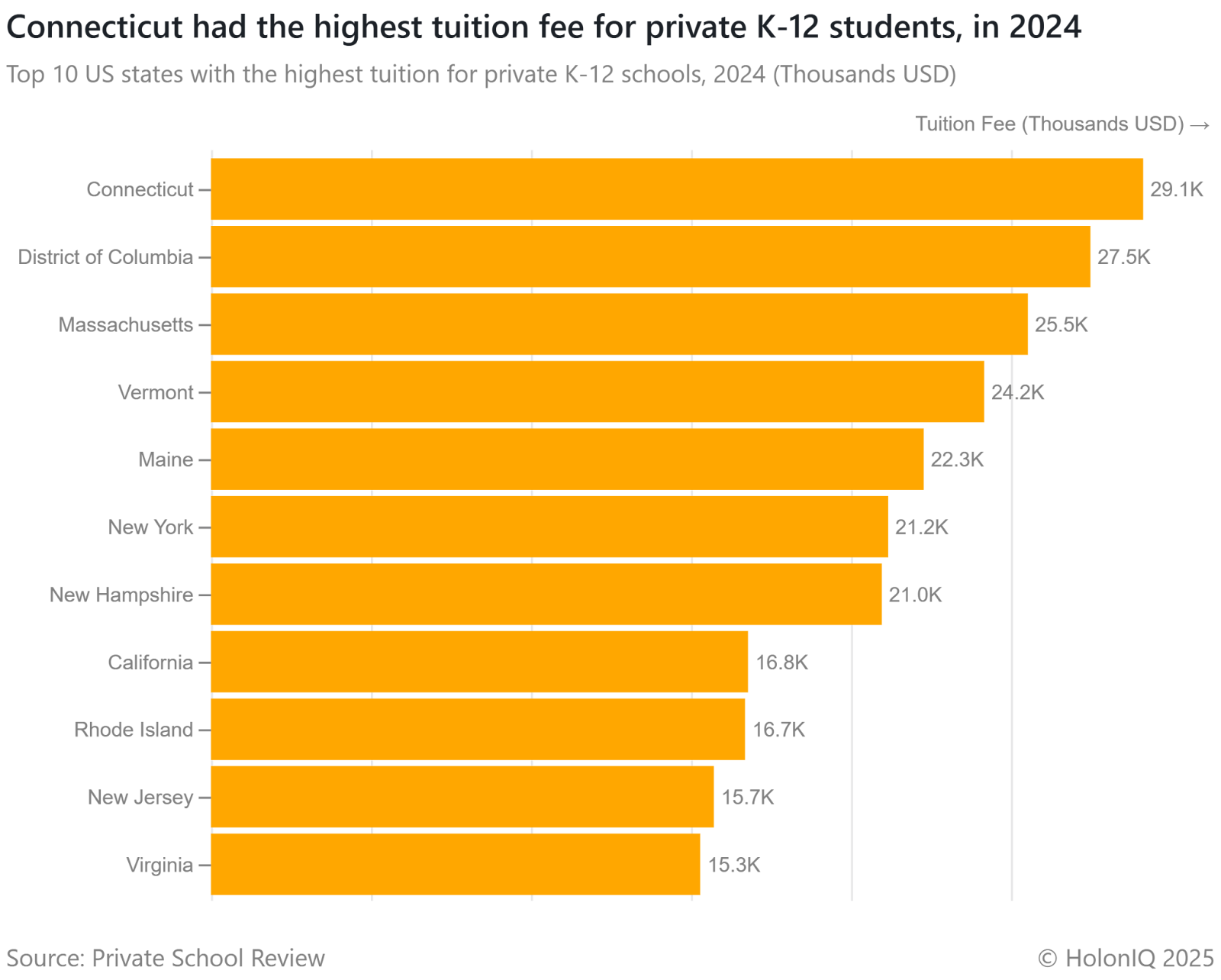 Connecticut tops the list of private K-12 tuition in 2024 at $29,133, followed by DC at $27,484 and Massachusetts at $25,529.Rising tuition pressures families and may widen access gaps, particularly outside of major urban centers. High tuition is often linked to smaller class sizes and stronger academic outcomes, though it raises equity concerns. State level voucher programs, such as Florida’s universal school choice initiative, aim to ease affordability challenges.