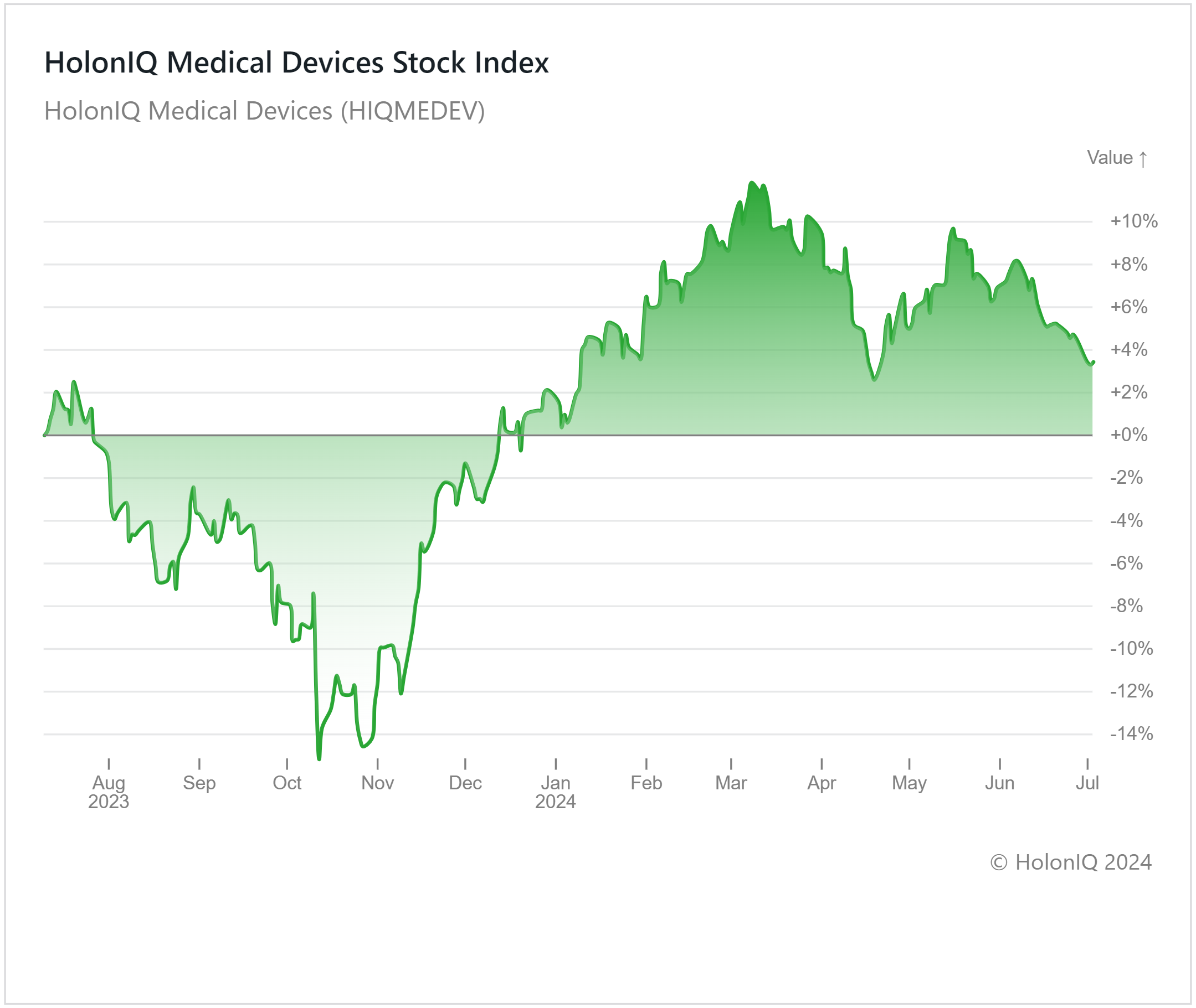 However, recent months have seen volatility, culminating in a 4% decline over the past quarter. This downturn stems from multiple pressures, such as governments worldwide pushing to lower healthcare costs and intensifying pricing pressures on medical devices, particularly in hospital settings. Regulatory hurdles, such as the European Medical Device Regulation and China's local innovation initiatives, have added complexity and uncertainty, impacting operational strategies. This has been reflected in key stocks within the index, with notable declines seen in significant players like Medtronic ($99B MCap), Abbott Laboratories ($178B MCap), and Stryker Corp ($126B MCap), showing decreases of 9%, 8%, and 5% respectively over the past quarter.