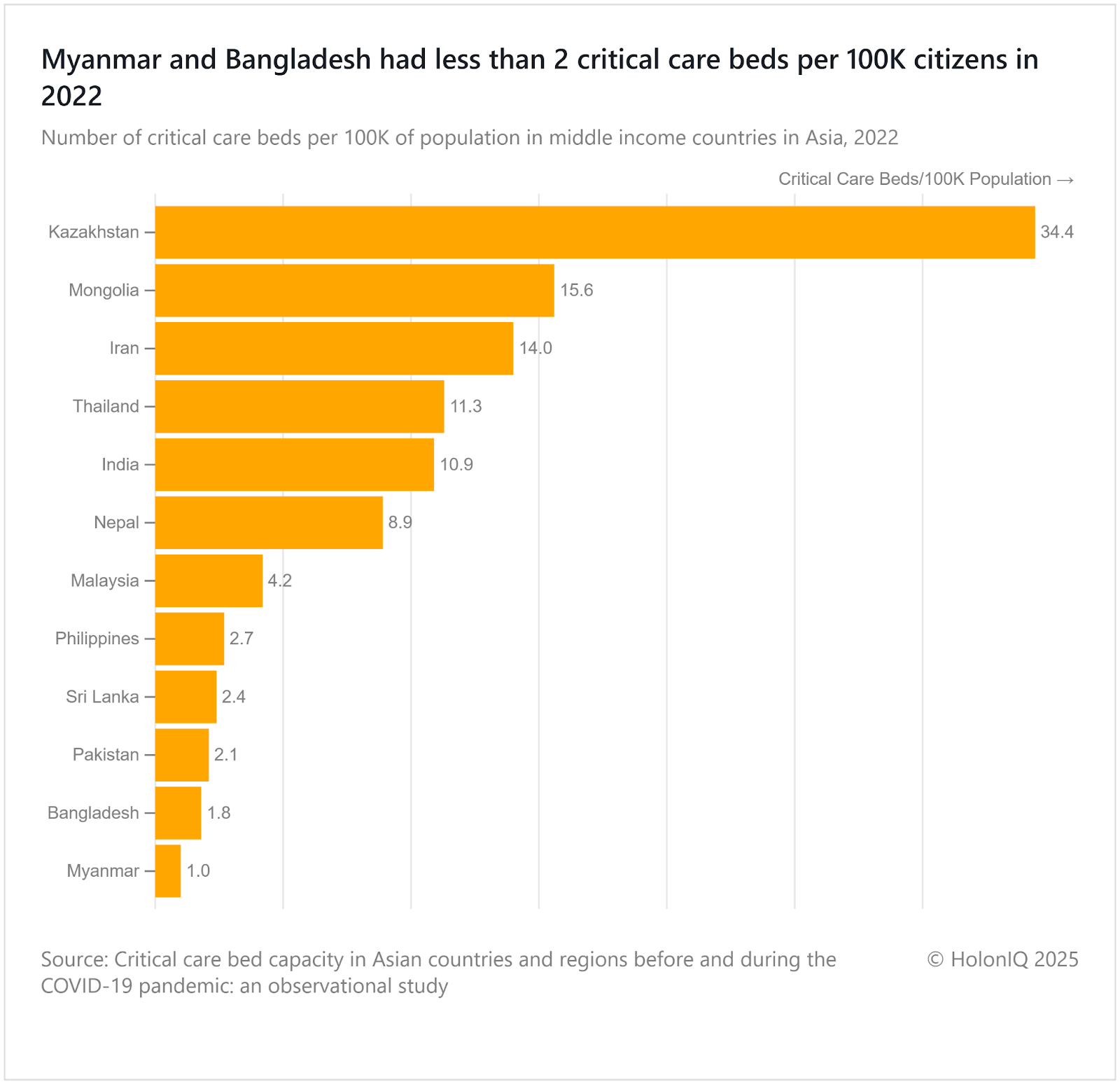 Myanmar and Bangladesh had significantly fewer critical care beds per 100K than regional peers in 2022 due to systemic failures. Myanmar's healthcare infrastructure collapsed following the 2021 military coup alongside a 40% poverty rate. Bangladesh faces inadequate infrastructure, spending just 2.48% of GDP on healthcare against WHO's 5% recommendation, with only 0.3 beds per 1,000 population and severe doctor shortages. Poor governance, corruption, and uneven resource distribution compound deficits. Conversely, Kazakhstan's 34.4 beds reflect post-Soviet infrastructure investments and higher healthcare spending.