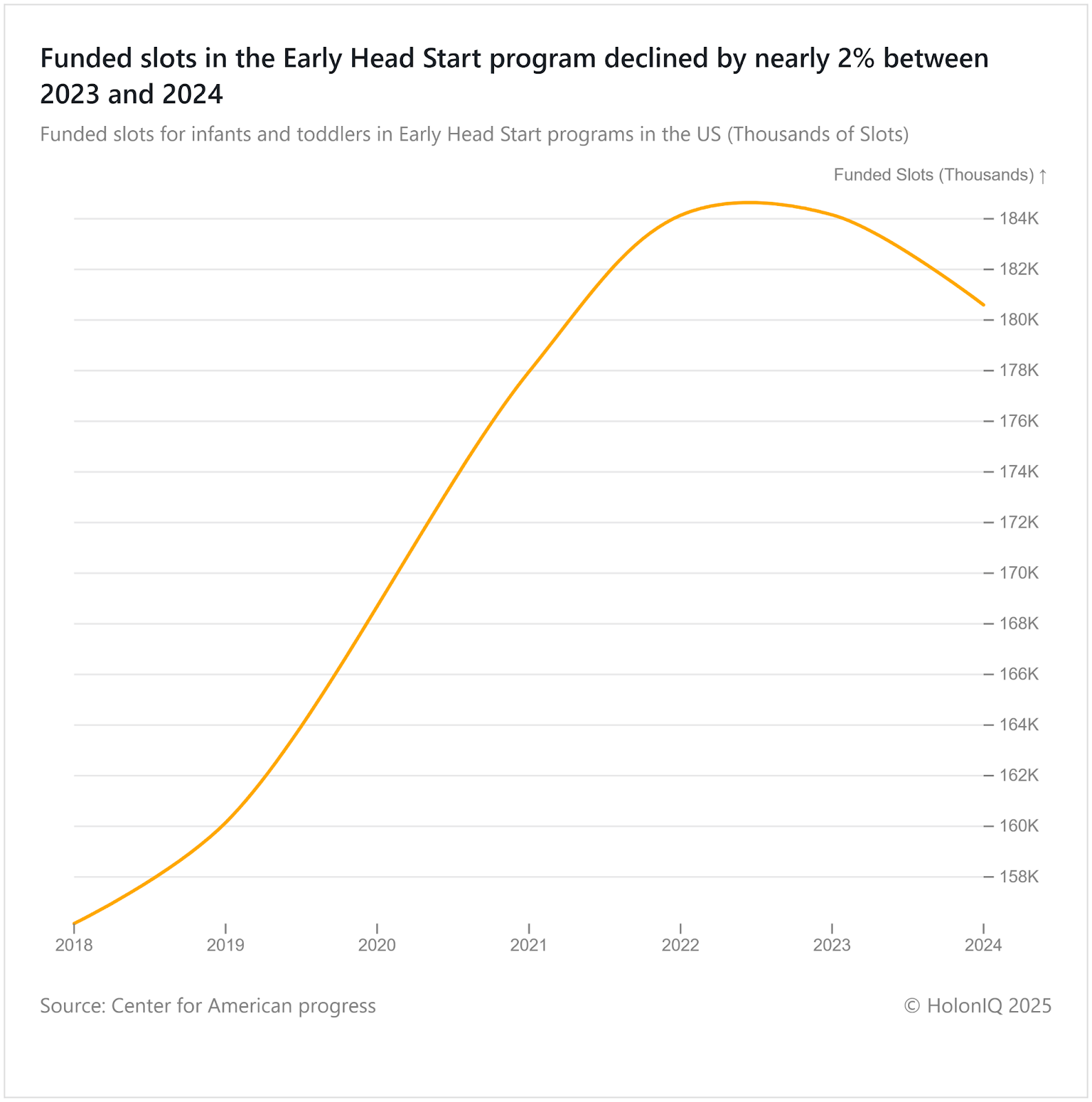 Funded slots for infants and toddlers in Early Head Start programs dropped to 180K in 2024, down from 184K the year before. The decline breaks a short recovery after pandemic disruptions. It stabilizes as more mothers rejoin the workforce, reflecting ongoing child care shortages nationwide. The federal government is aiming to ease this pressure through the Biden administration’s Child Care Stabilization Grants, run by the US Department of Health and Human Services.