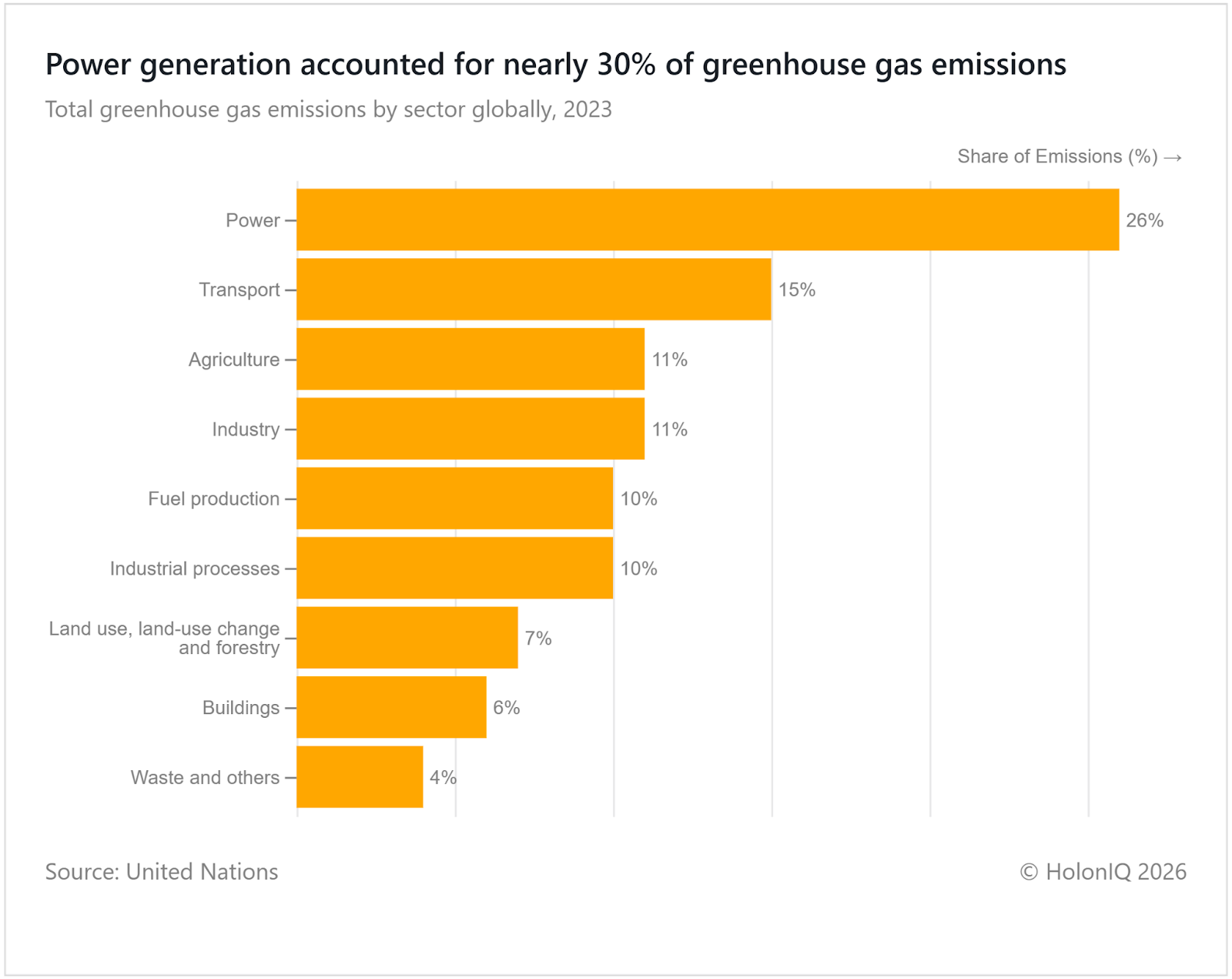 The power sector accounted for the largest share of global greenhouse gas emissions in 2023 at 26%. This reflects continued global dependence on coal, gas, and oil for electricity generation, particularly in fast growing economies with rising energy demand. Many countries still lack sufficient renewable capacity and modern grids to support large-scale clean energy use. As a result, fossil fuel power plants continue to dominate generation. Under the Paris Agreement, governments are accelerating investments in renewables, storage, and grid modernisation to reduce emissions from electricity systems.