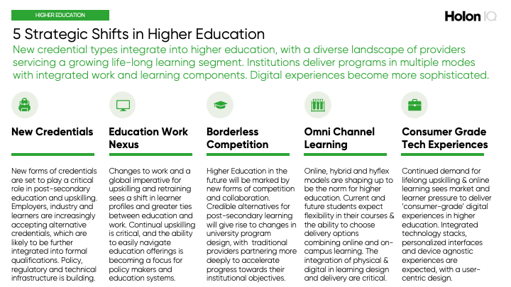 Over the coming decade, many ‘fundamentals’ of higher education will remain as they are, while others will see significant change - new credential types are likely to integrate into higher education, with a diverse landscape of providers servicing a growing life-long learning segment. Institutions will deliver programs in multiple modes with integrated work & learning components, and digital experiences will become more sophisticated for on-campus, hybrid, and online students. Dive deeper into the 5 Strategic Shifts in Higher Education and learn more about how HolonIQ supports institutions in their most important strategic decisions.