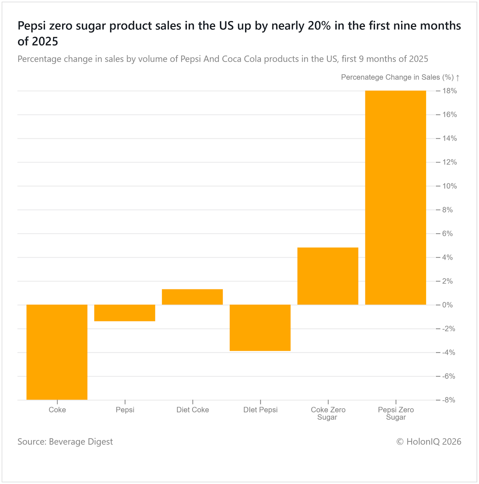 Pepsi Zero Sugar sales increased by nearly 20% alongside Coke Zeroโs 4% in early 2025, while regular Coke declined as much as 8%. This shows how the consumer beverage market is seeing a generational shift in demand, as newer generations of consumers are avoiding traditional alcohol and sugary sodas, citing health concerns. Both beverage giants are diversifying beyond traditional sodas as PepsiCo launched Pepsi Prebiotic Cola and Coca-Cola introduced Simply Pop. This has also allowed newer companies to rally their products around healthier options and functionality to enter a once sealed market of consumer beverages.