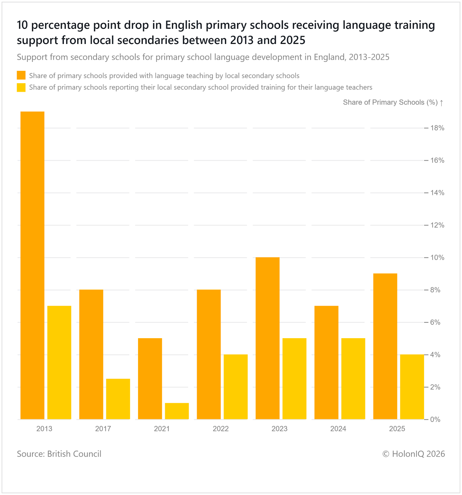 English primary schools receiving language support from local secondaries dropped 10 percentage points from 2013 to 2025. This decline is largely due to a lack of proper resource transfer channels from local secondaries to primaries, and a shift in education focus to more STEM fields from primary age. Teacher shortages persist in many primary schools due to a lack of qualified teachers in these fields and premature departure from the education field. Restructuring measures include creating language hubs, vocational pathways, and the issuance of Applied Languages certificates.