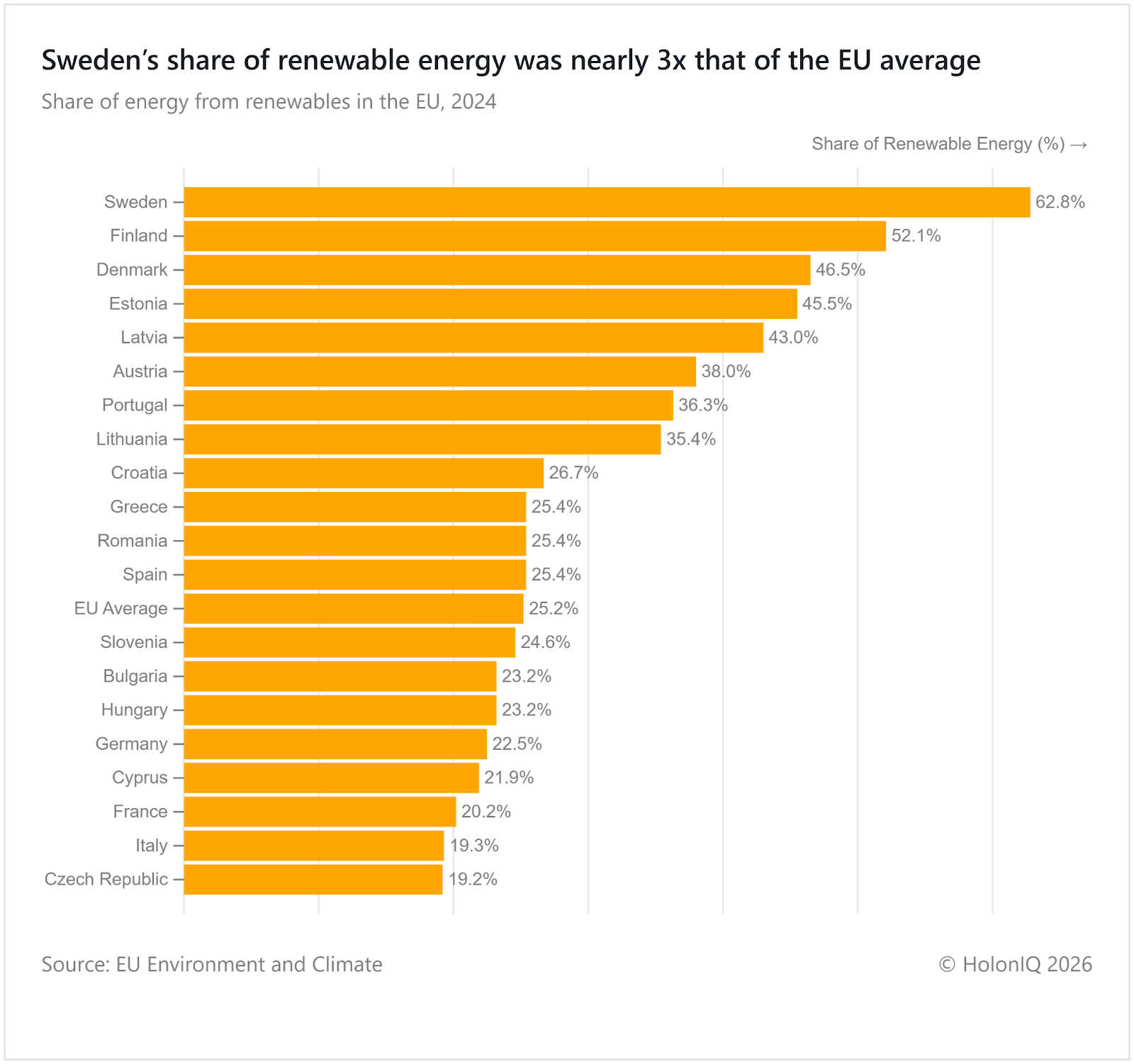 Swedenโs renewable share in 2024 was nearly three times that of the EU average, which reflects decades of investment in hydropower, biomass and wind energy. Strong carbon taxes and early phaseouts of fossil fuels pushed Swedish industries and households toward clean energy. Across the EU, environmental awareness is driven by strict climate laws for sustainability and long-term targets under the European Green Deal. These policies link energy security, economic growth and climate responsibility into one shared strategy.