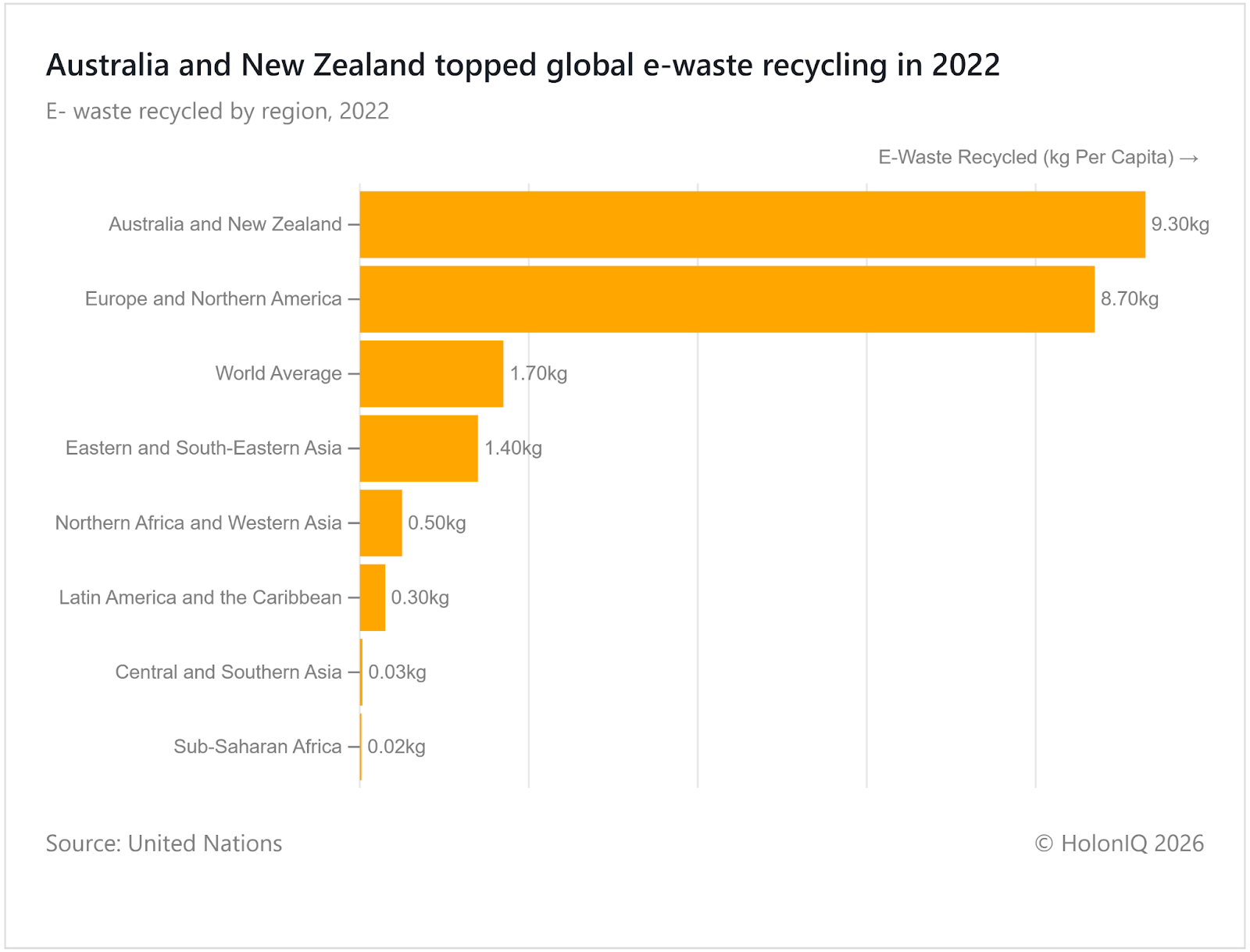 In 2022, Australia and New Zealand recorded the highest e-waste recycling rate at nearly 10kg per person and also generated the largest amount of e-waste globally. This reflects strong national recycling systems and well funded waste management infrastructure. Strict environmental regulations require producers and retailers to support electronic waste collection. Recycling e-waste is difficult because electronic devices contain complex mixtures of plastics, metals and hazardous materials that are costly and technically challenging to separate and process safely.