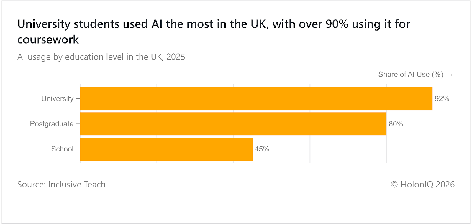 AI use in the United Kingdom reached over 90% among university students and 80% among postgraduates. The high uptake among undergraduates reflects heavy coursework demands, research tasks, and familiarity with digital learning tools. Universities increasingly integrate AI for coding assistance, writing support, and data analysis. The trend mirrors growing reliance on digital study tools across higher education. The Artificial Intelligence Regulation Framework implemented by the UK Government guides responsible AI use in education.