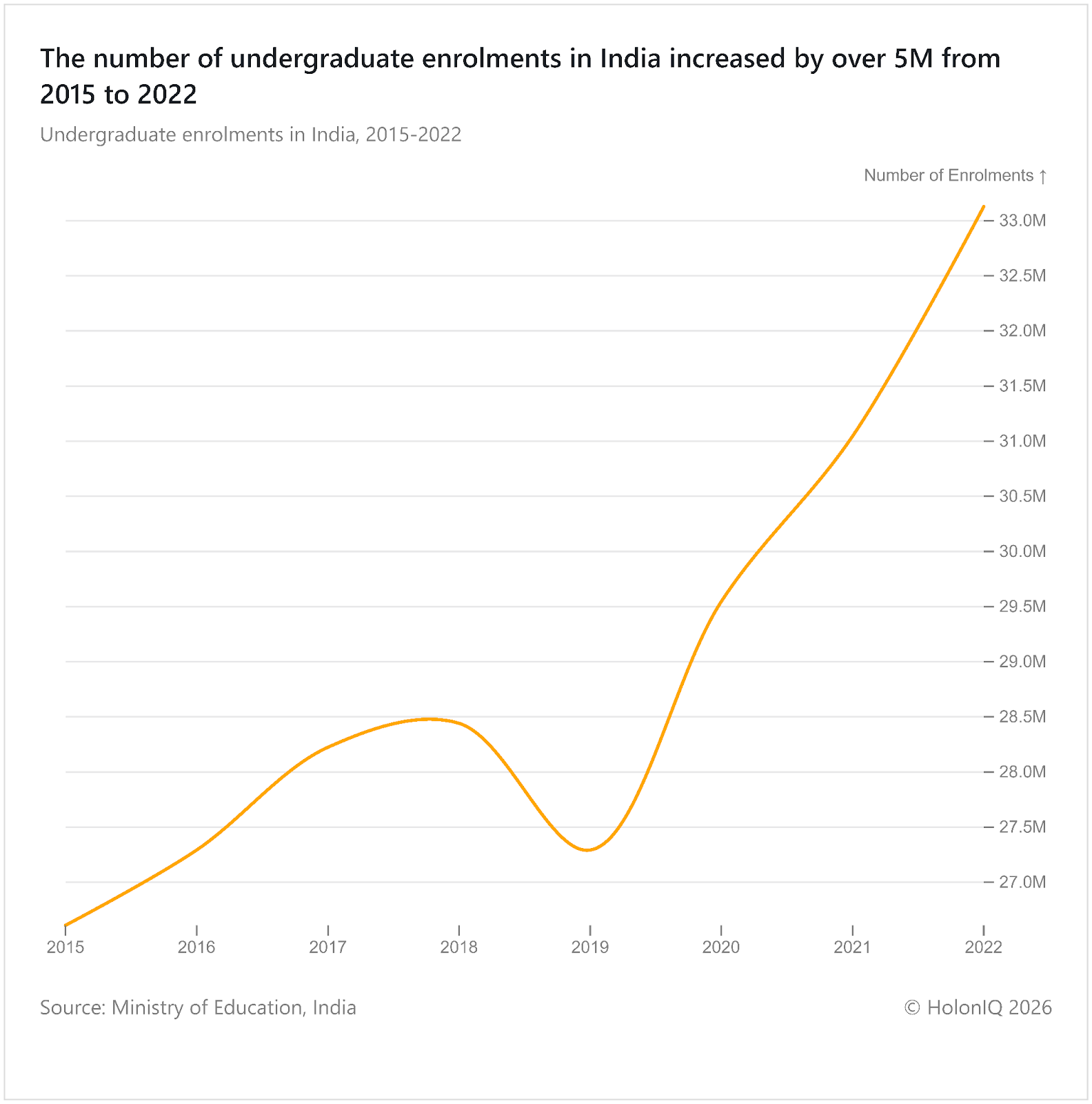 Undergraduate enrolments in India increased by more than 5M students between 2015 and 2022. The upward trend reflects expanding access to higher education and growing demand for university qualifications among young people. Rising enrolments also signal a larger future workforce with tertiary skills supporting economic development. The National Education Policy 2020, implemented by the Government of India, aims to expand higher education participation and improve institutional capacity.