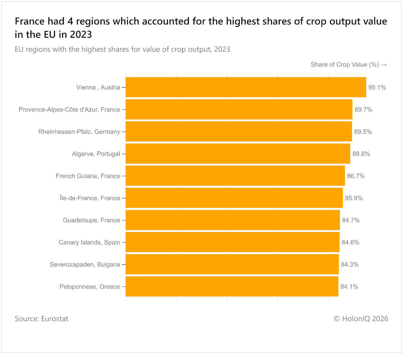 Several regions in the European Union reported crop output shares above 84% in 2023, including four regions in France. The data shows crop production dominating agricultural value in many regions with favourable climates, specialised farming systems, and strong market access. Mediterranean and peri-urban regions often focus on high value crops such as fruits, vegetables, and wine. The Common Agricultural Policy implemented by the European Commission supports regional agricultural productivity and sustainability.