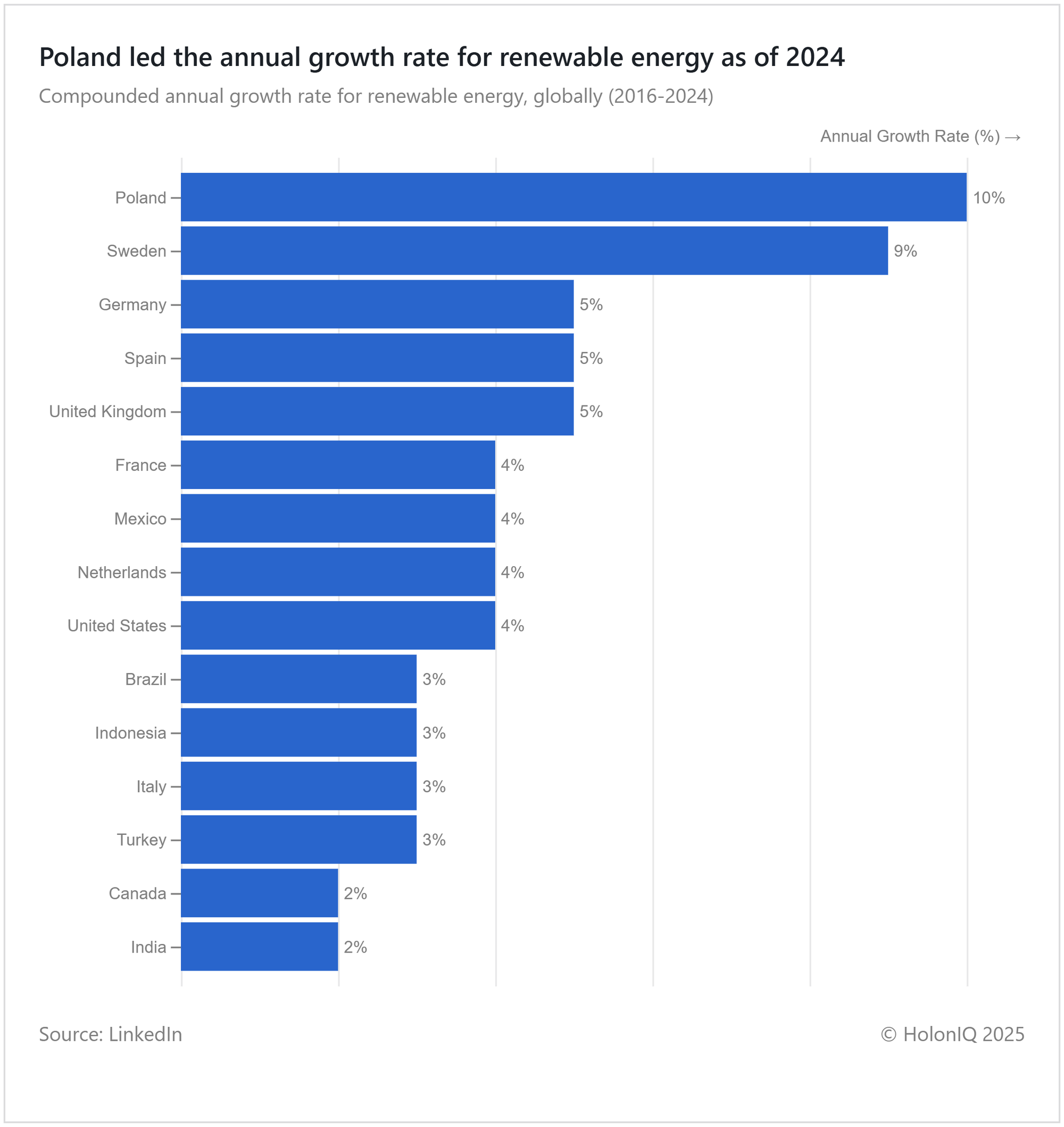 From 2016 to 2024, Poland recorded a 10% compounded annual growth rate in renewable energy, highlighting a rapid shift away from fossil fuels. Overall, the data reflects a global acceleration in clean energy investment, with several countries surpassing 4–5% growth annually. The EU’s REPowerEU plan continues to play a central role in supporting renewable energy deployment across member states. This expansion is driven by energy security concerns, falling technology costs, and climate commitments.