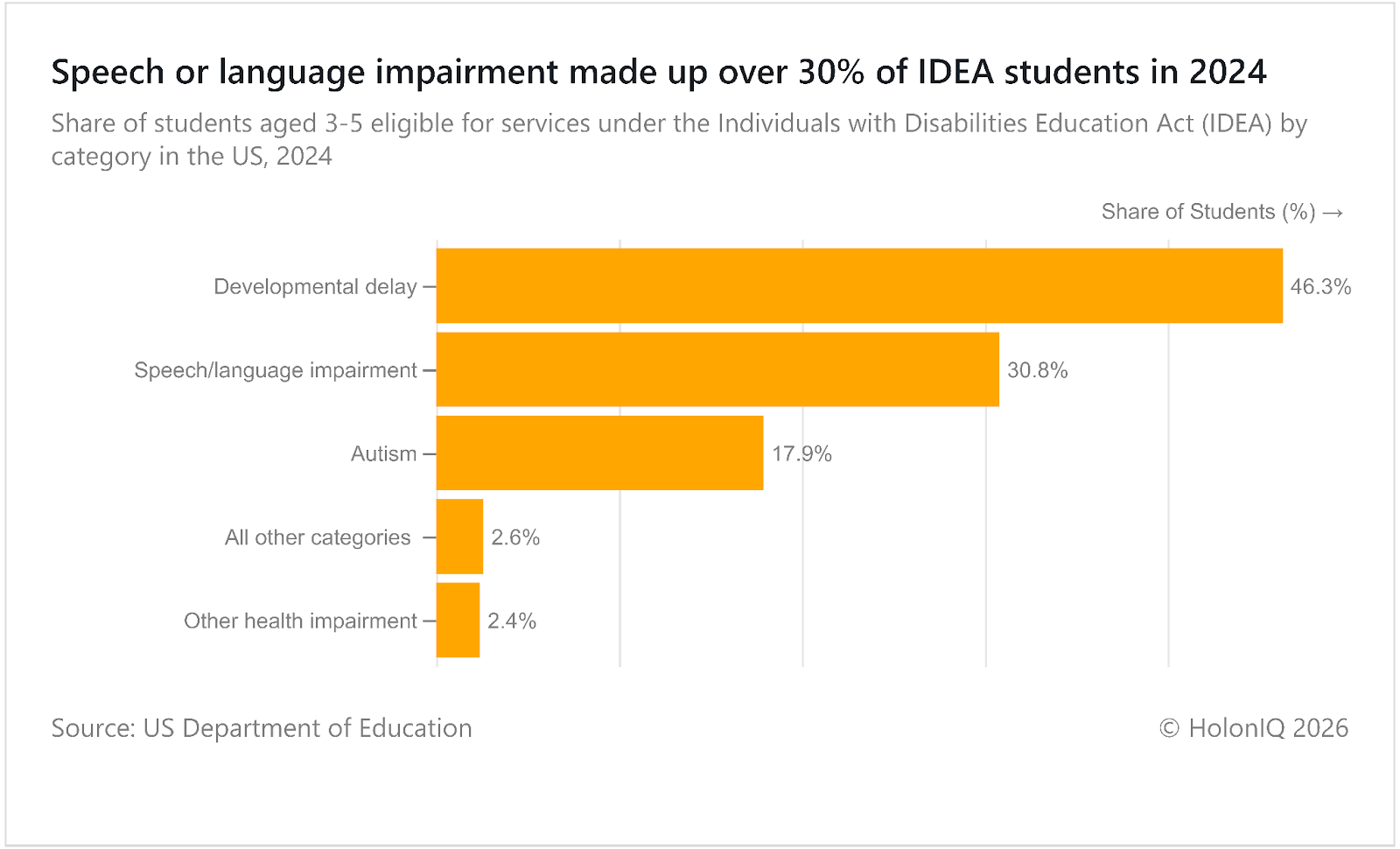 Among IDEA-eligible students aged 3-5 in the United States in 2024, speech and language impairments account for over 30% of cases. Early identification of speech challenges, autism and delayed learning allows targeted interventions that improve communication skills before children enter primary school. The number of students identified with these disabilities is increasing yearly, reaching nearly 10M, reflecting both the prevalence of early language delays and the emphasis of early childhood programmes on supporting foundational learning. The Individuals with Disabilities Education Act, implemented by the US Department of Education, ensures access to specialised early services.
