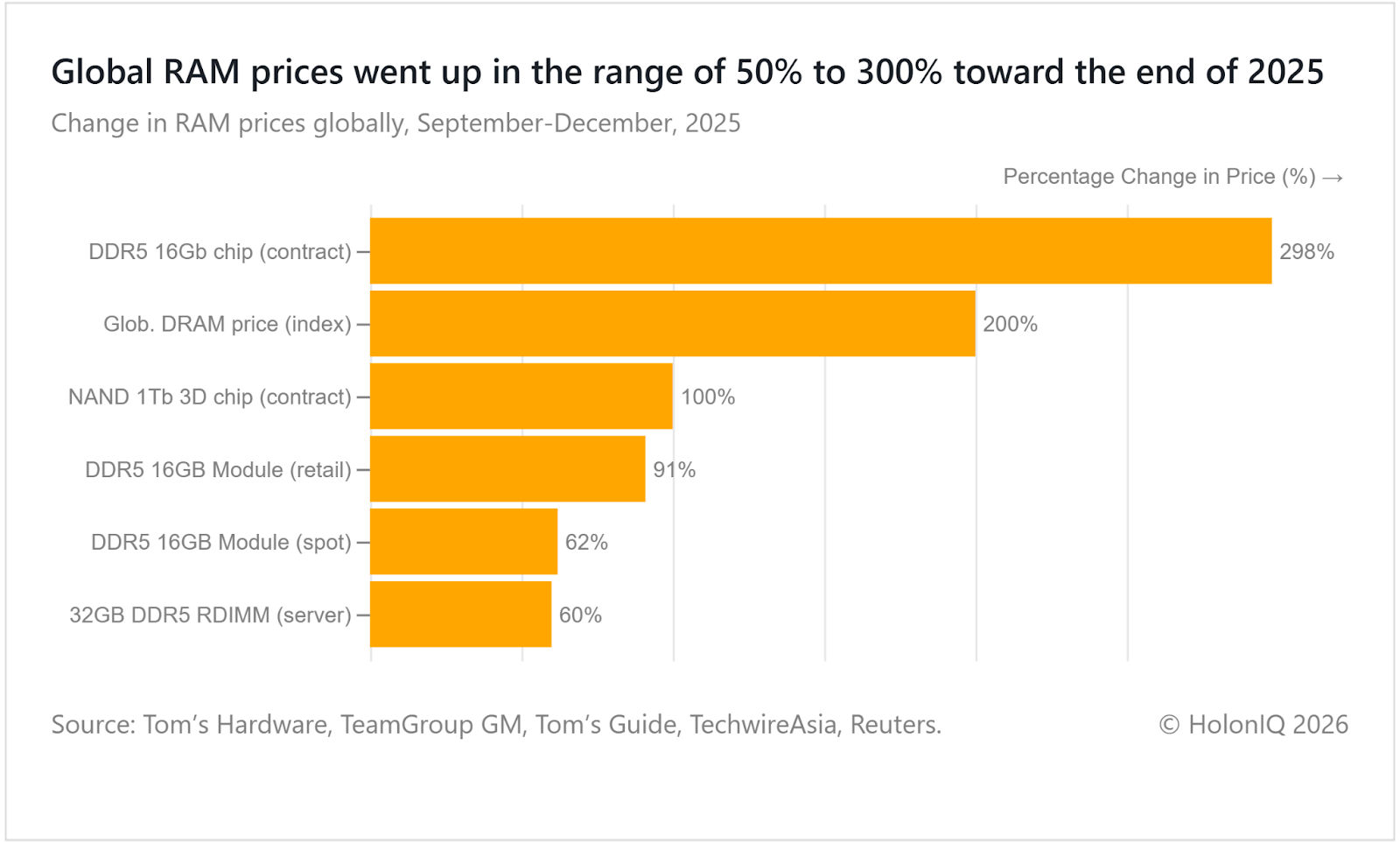 By late 2025, global RAM prices increased by 50-300%, driven by an acute memory shortage as AI development accelerated faster than supply expansion. Demand is highly concentrated among hyperscalers and AI leaders like NVIDIA and OpenAI, crowding out smaller buyers and enterprises. Limited fab capacity, long lead times, and HBM prioritisation for AI chips have made RAM increasingly inaccessible and costly, constraining broader tech investment. This shortage has also seeped into consumer technology, as new consumer tech products such as laptops have also risen in price due to RAM component scarcity.