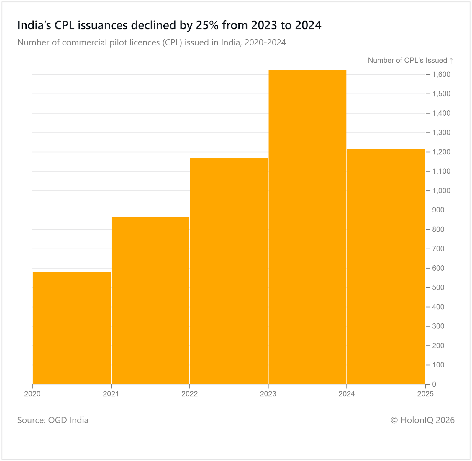 India's CPL issuances fell in 2024 following a year-on-year high, exposing severe aviation workforce shortages. India needs 30,000 pilots over 15-20 years, but currently has only 11,775, with training not keeping up to meet the target. Recent FDTL regulations, increasing rest from 36 to 48 hours, limiting night landings, were all contributors to the recent IndiGo crisis, cancelling 4,500 flights (December 2025), dropping on-time performance to 35%. New measures to revive the Indian aviation sector include additional funding for pilot training and streamlined clearances for new airlines to enter the Indian market.