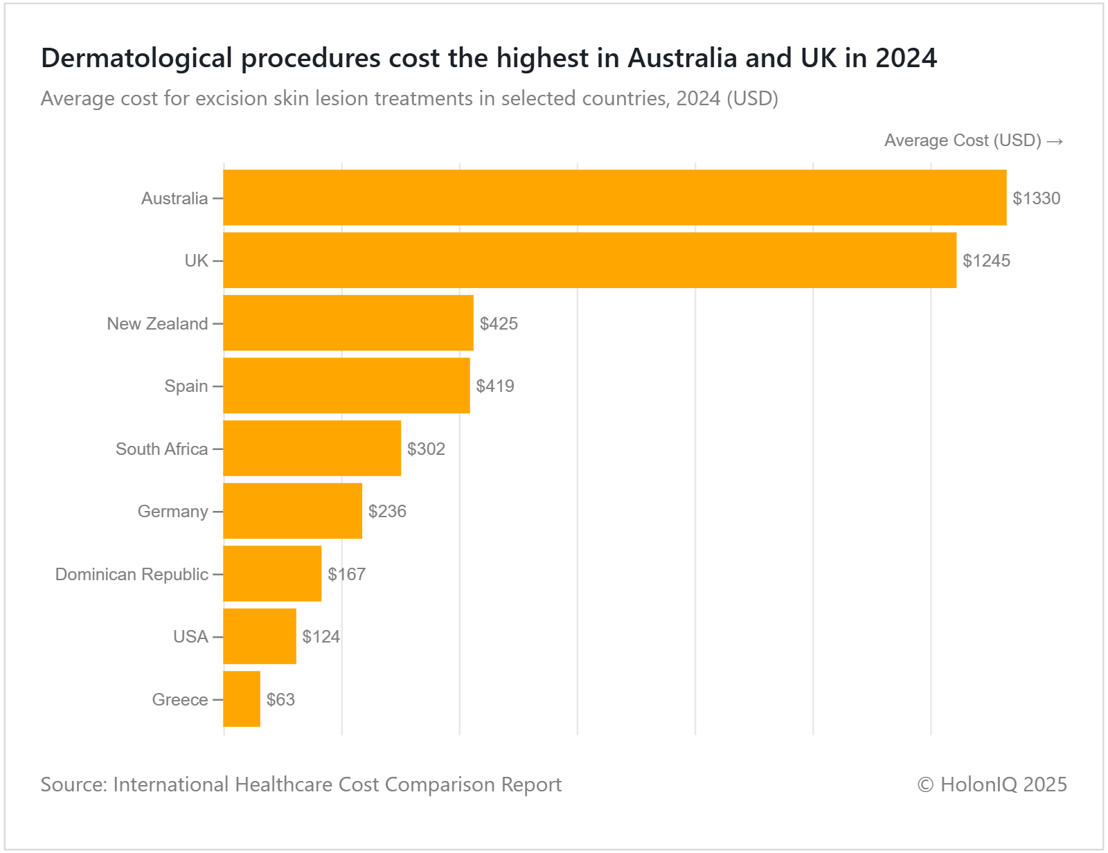 Dermatological procedures cost the highest in Australia and the UK in 2024, driven by specialist training costs, equipment expenses, and inadequate Medicare rebate indexation since the mid-1980s. Australian clinics cited rising supply costs, staff salaries, and operating expenses forcing 2024 fee increases, while private practice dominance exacerbates patient financial burden. Australia and the UK have been making consistent efforts to maximise healthcare budgets to ease pressures, despite talent shortages and rising costs of materials, while supporting cost-effective prevention programs to address rising skin cancer costs.